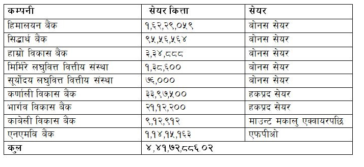 नेपाल स्टक एक्सचेन्जा अुनसार यस साता १९३ वटा कम्पनीको कूल १ करोड २ लाख ५५ हजार ६ सय ८० कित्ता शेयर खरिद विक्री भएको छ ।