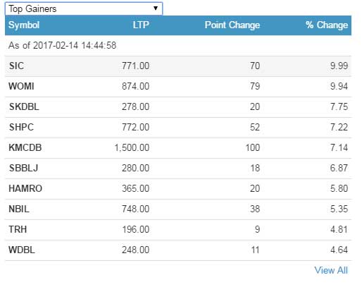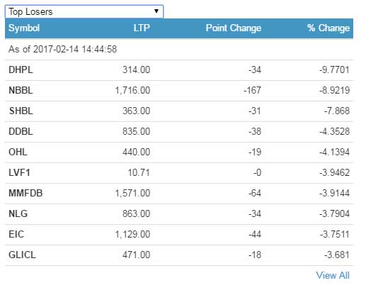 सामान्य अंकले घटेको बजारमा सगरमाथा इन्स्योरेन्सका लगानीकर्ताले आफ्नो आम्दानी झण्डै १० प्रतिशतले बढाएका छन् । त्यस्तै ओम माइक्रोफाइनान्स वित्तिय सस्थाका लागानीकर्ताले ९.९४ प्रतिशतले र सप्तकोशी डेभलपमेन्ट विकास बैंकका लागानीकर्ताले आफ्नो आम्दानी ७.७५ प्रतिशतले बढाउन सफल भएका छन् ।