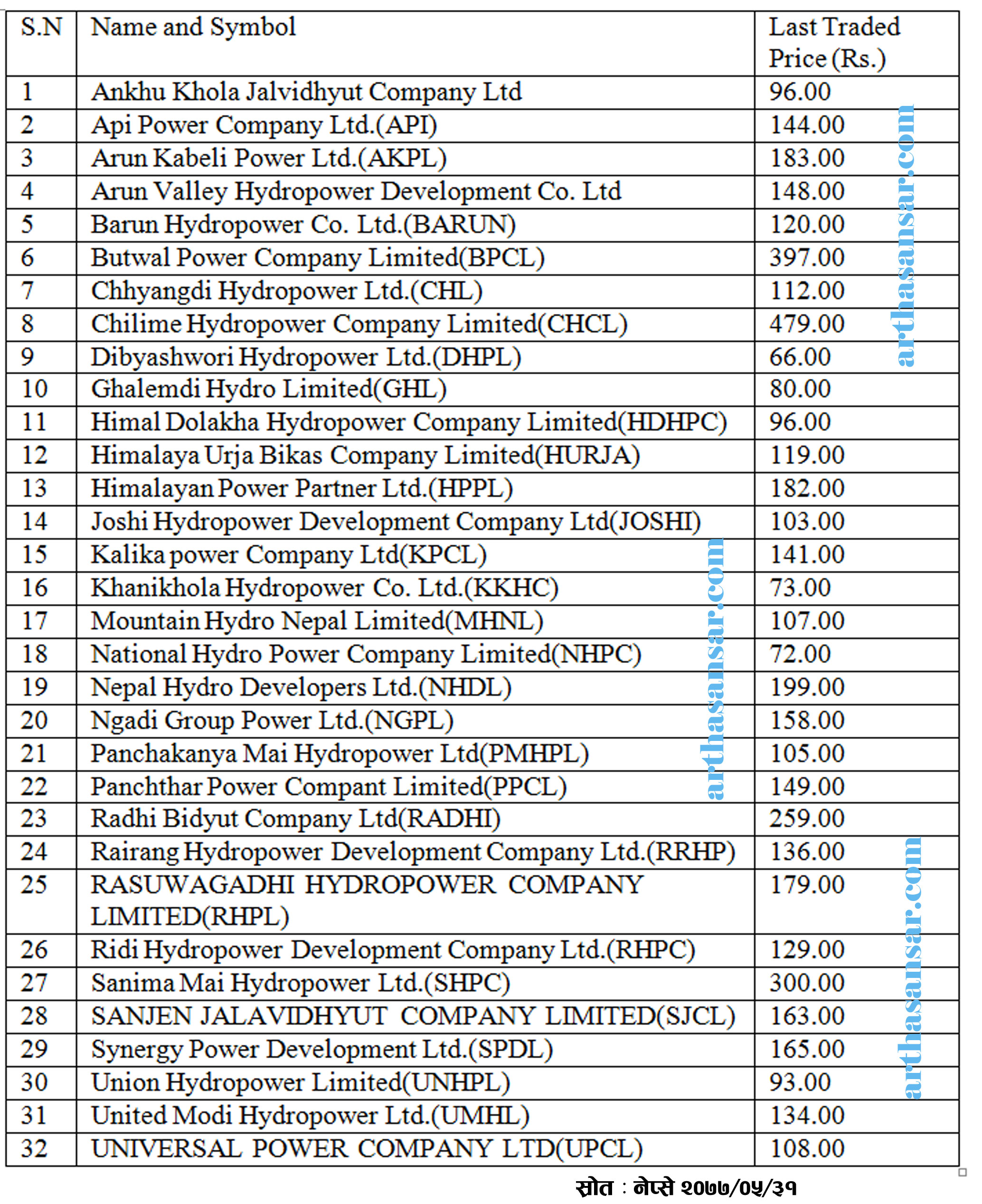 जसमा ७ वटा कम्पनीको शेयर मूल्य अझै अंकित मूल्य भन्दा कम रहेका छन् । त्यसै गरी २० वटा कम्पनीको शेयर मूल्य १ सयदेखि २ सयको बिचमा रहेको छ बाँकी ८ वटा कम्पनीको शेयर मूल्य २ सय भन्दा माथि छ । सवै भन्दा धेरै चिलिमे हाइड्रोपावर कम्पनी लिमिटेडको प्रतिकित्ता ४ सय ७९ रुपैयाँ रहेको छ ।