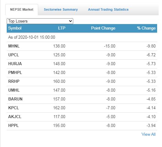 अर्थ संसार, काठमाडौं- निरन्तर ओरालो लागेको शेयर बजार साताको अन्तिम दिन बिहिबार (आज) दोहोरो अंकले बढेको छ । नेपाल स्टक एक्सचेञ्जका अनुसार आज शेयर कारोबार मापक नेप्से परिसूचक २०.६४ अंकले बढेर एक हजार ५७१.०७ मा पुगेकाे छ ।