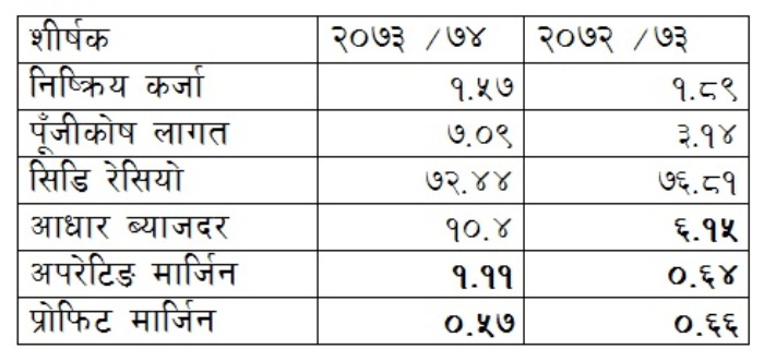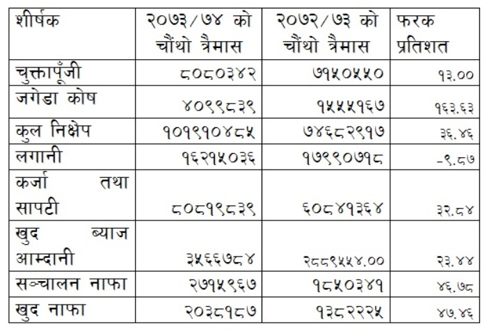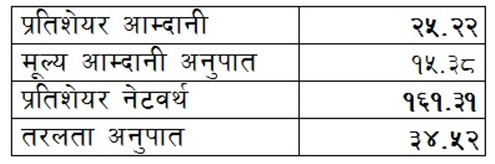 खुद ब्याज आम्दानी रू।३ अर्ब ५६ करोड, सञ्चालन नाफा रू।२ अर्ब ७१ करोड, कर्मचारी खर्च रू। ७६ करोड ७७ लाख र अन्य सञ्चालन खर्च रू।९० करोड ६८ लाखभन्दा बढी रहेको छ ।
