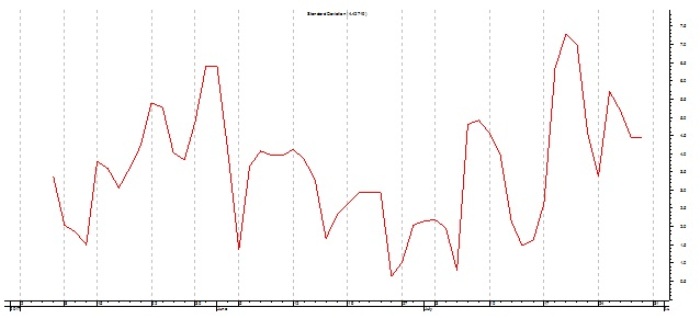 स्ट्याण्डर्ड डेभिएसन स् बैङ्कको ५९ दिनको कारोबारमा स्ट्याण्डर्ड डेभिएसन ४ दशमलव ४२ विन्दुमा छ । उतारचढाव सामान्य रहेको छ ।