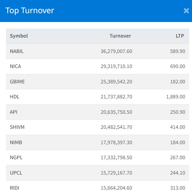 त्यस्तै, एनआइसी एशिया बैंकको २ करोड ९२ लाख, ग्लोबल आईमई बैंकको २ करोड ५३ लाख, हिमालयन डिष्टिलरीको २ करोड १७ लाख रुपैयाँ र अपि पावर कम्पनीको २ करोड ६ लाख रुपैयाँमाथिको कारोबार भएको छ ।