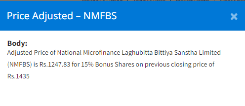 स्टकको अनुसार नेश्नल माइक्रोफाइनान्स लघुवित्त वित्तीय संस्था लिमिटेडको १५ प्रतिशत बोनस सेयरपछि नेप्सेले प्रतिकित्ता १२४७.८३ रुपैयाँ कायम गरेको हो । नेप्सेले आइतबारको अन्तिम कारोबार मूल्य १४३५ रुपैयाँको आधारमा मूल्य समायोजन गरेको हो ।