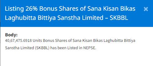 त्यस्तै, साना किसान लघुवित्त वित्तीय संस्थ लिमिटेडको २६ प्रतिशत बोनस बापतको ४० लाख ६७ हजार ४ सय ७५ दशमलव ६९१८ कित्ता सेयर नेप्सेमा कारोबार हुन सक्ने गरी सूचिकृत भएको हो ।