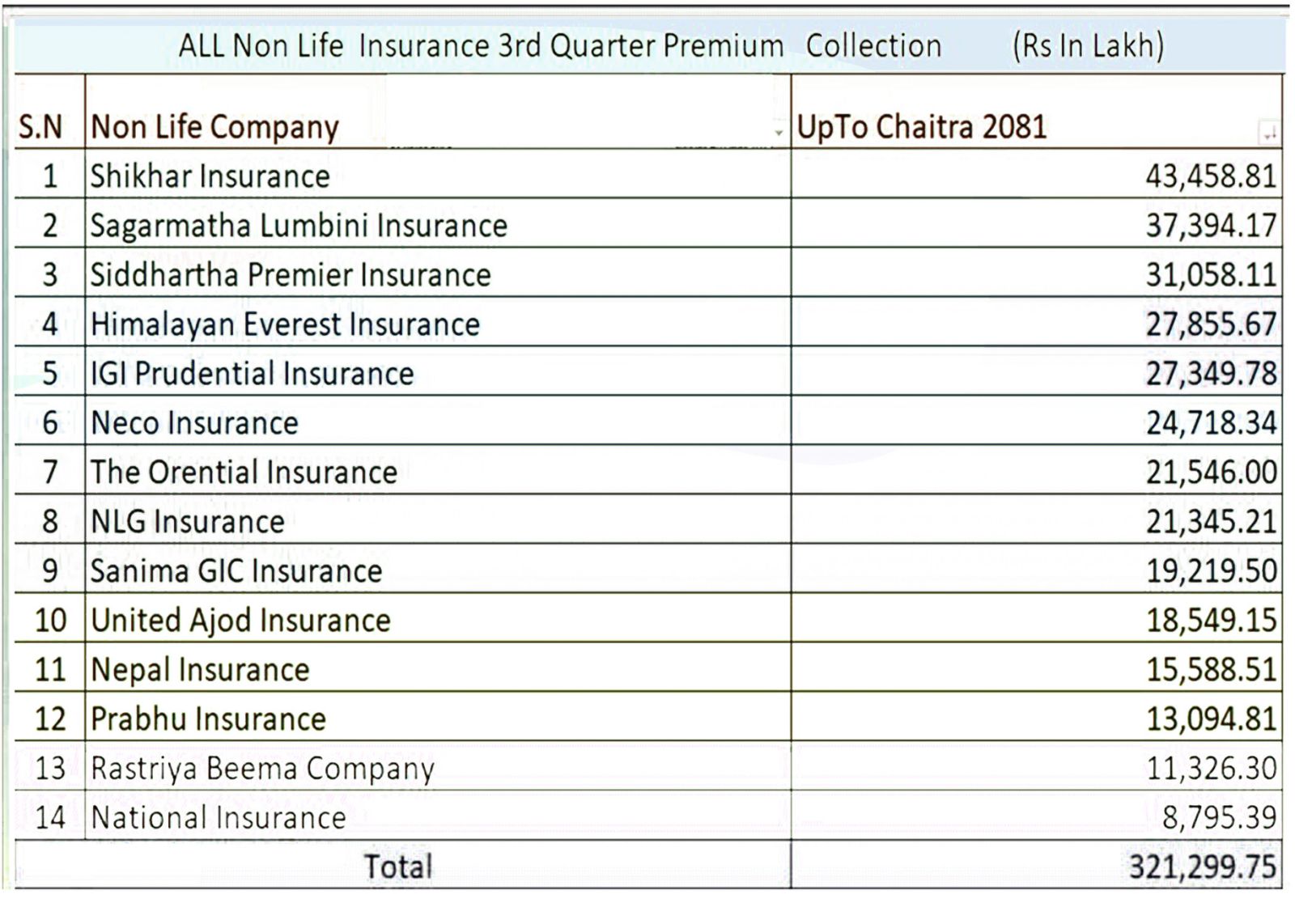यस अवधिमा सबैभन्दा बढी बीमाशुल्क संकलन गर्नेमा शिखर इन्स्योरेन्स रहेको छ। कम्पनीले तेस्रो त्रैमासको अवधिसम्मा ४ अर्ब ३४ करोड रुपैयाँ कुल बीमाशुल्क आर्जन गर्न सफल भएको छ। दोस्रोमा सगरमाथा इन्स्योरेन्स रहेको छ । कम्पनीले यस अवधिसम्मा ३ अर्ब ७३ करोड रुपैयाँ कुल बीमाशुल्क आर्जन गर्न सफल भएको छ । तेस्रोमा सिद्धार्थ प्रिमियम इन्स्योरेन्स रहेको छ। कम्पनीले यस अवधिसम्ममा ३ अर्ब १० करोड रुपैयाँ कुल बीमाशुल्क आर्जन गर्न सफल भएको छ। हिमालयन एभरेष्ट इन्स्योरेन्सले २ अर्ब ७८ करोड रुपैयाँ कुल बीमाशुलक संकलन गरेको छ । आइजिआई प्रुडेन्सियल इन्स्योरेन्सले २ अर्ब ७३ करोड रुपैयाँ कुल बीमाशुलक संकलन गरेको छ । नेको इनस्योरेन्सले २ अर्ब ४७ करोड रुपैयाँ कुल बीमाशुलक संकलन गरेको छ । ओरिएन्टल इन्स्योरेन्सले २ अर्ब १५ करोड रुपैयाँ कुल बीमाशुलक संकलन गरेको छ ।