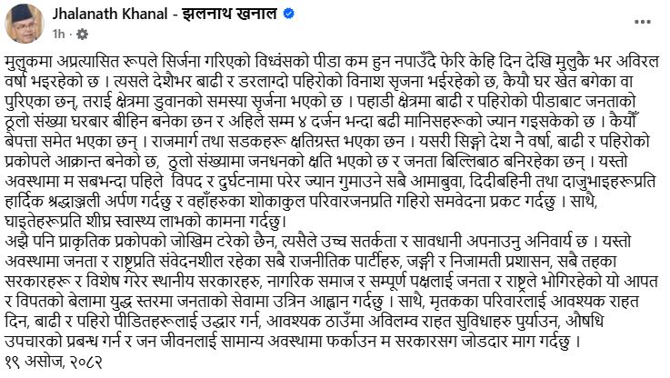 ‘अझै पनि प्राकृतिक प्रकोपको जोखिम टरेको छैन, त्यसैले उच्च सतर्कता र सावधानी अपनाउनु अनिवार्य छ,’ खनालले सामाजिक सञ्जालमा लेखेका छन् ।