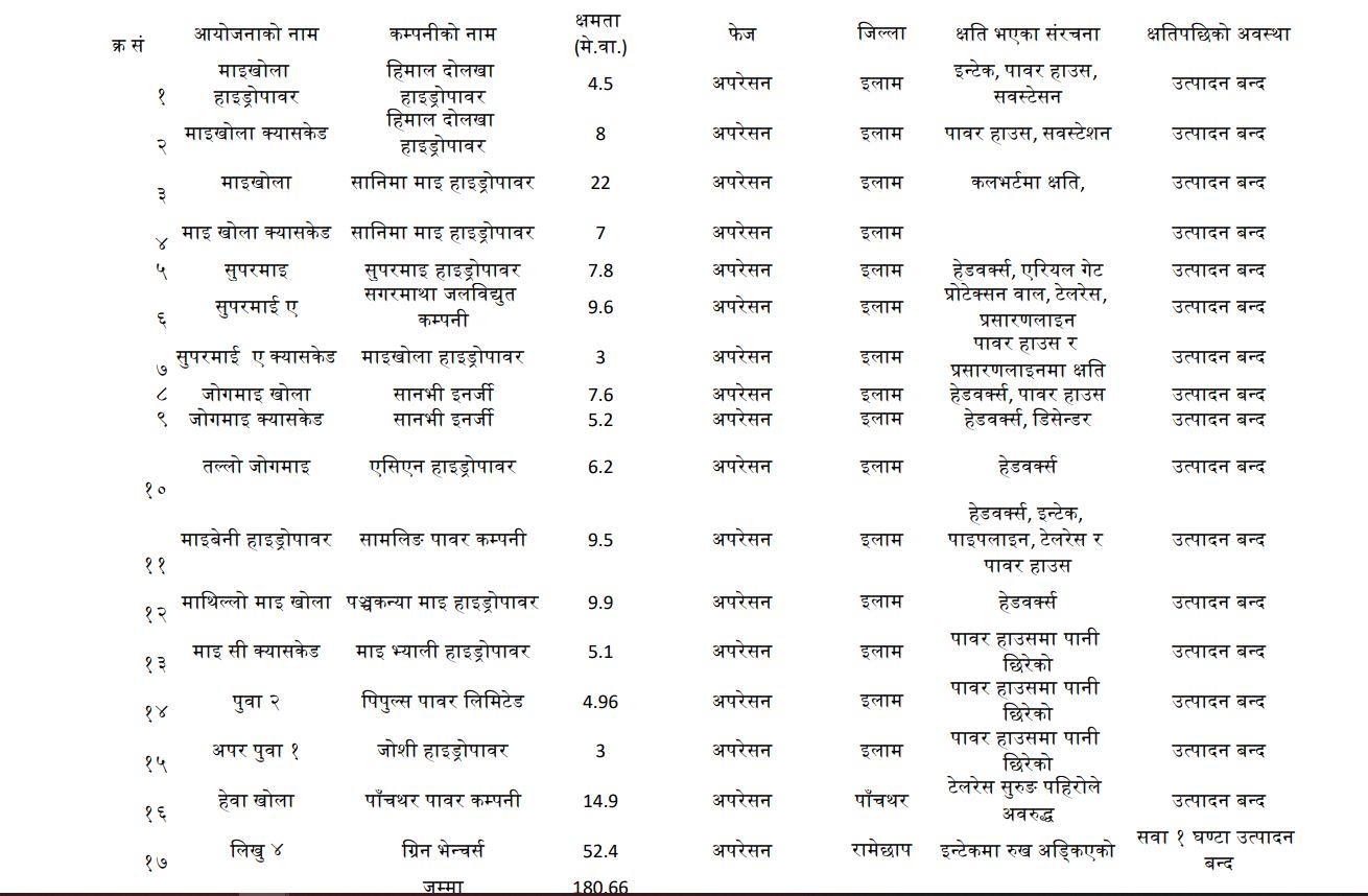बाढी पहिरोका कारण सबैभन्दा बढी प्रभावित भएको कोशी प्रदेशको इलाम जिल्लामा जलविद्युत आयोजनाहरु पनि सबैभन्दा धेरै प्रभावित भएका छन् । इलाममा मात्रै सञ्चालनमा आएका १५ वटा जलविद्युत आयोजनाहरुको उत्पादन बन्द भएको छ । जसमा ४.५ मेगावाटको माईखोला, ८ मेगावाटको माईखोला क्यासकेड, २२ मेगावाटको माईखोला (सानिमा माई), ७ मेगावाटको माई क्यासकेड, ७.८ मेगावाटको सुपरमाई, ९.६ मेगावाटको सुपरमाई ए, ३ मेगावाटको सुपरमाई ए क्यासकेड, ७.६ मेगावाटको जोगमाई खोला, ५.२ मेगावाटको जोगमाई क्यासकेड, ६.२ मेगावाटको तल्लो जोगमाई, ९.५ मेगावाटको माईबेनी, ९.९ मेगावाटको माथिल्लो माई, ५.१ मेगावाटको माई सी क्यासकेड, ४.९६ मेगावाटको पुवा २ र ३ मेगावाटको अपर पुवा १ जलविद्युत आयोजना इलाम जिल्लाका रहेका छन् ।