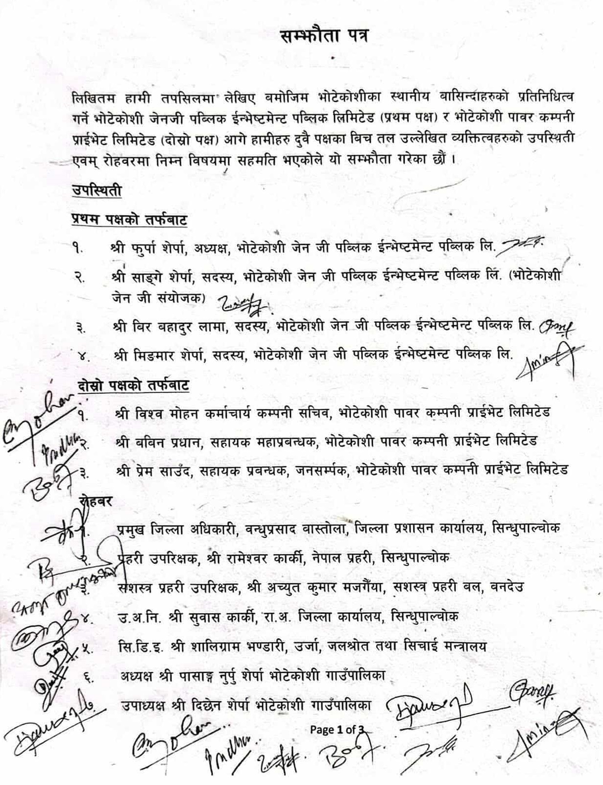 सम्झौतापत्रमा इन्भेस्टमेन्ट कम्पनीका तर्फबाट अध्यक्ष फुर्पा शेर्पा र अन्य प्रतिनिधिहरू तथा भोटेकोशी पावर कम्पनीका तर्फबाट कम्पनी सचिव विश्व मोहन कर्माचार्यसहितका पदाधिकारीहरूले हस्ताक्षर गरेका हुन्। पाँच बुँदे उक्त सम्झौताअनुसार जलविद्युत आयोजनाबाट प्रत्यक्ष प्रभावित स्थानीय जनतालाई समेटेर गठन गरिएको इन्भेस्टमेन्ट कम्पनीलाई १० प्रतिशत सेयर दिने सहमति भएको हो। यो सेयर अघिल्लो सम्झौता (२०७१ पुस ९ गते) अनुसार निर्धारण गरिएको ६ प्रतिशतमा थप ४ प्रतिशत जोडेर कायम गरिएको हो।