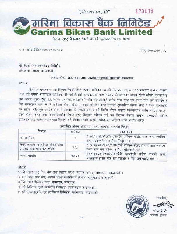 गरिमा विकास बैंकले आर्थिक वर्ष २०८१/८२ का लागि लाभांश घोषणा गरेको छ। बैंकको असोज २७ गते बसेको सञ्चालक समितिको बैठकले आफ्ना सेयरधनीहरूलाई गत आर्थिक वर्षको संचित मुनाफाबाट हाल कायम चुक्ता पूँजीको कुल १०.५३ प्रतिशत लाभांश वितरण गर्ने निर्णय गरेको हो।