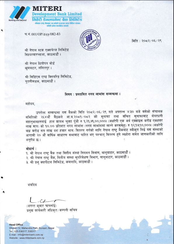 मितेरी डेभलपमेन्ट बैंकले आर्थिक वर्ष २०८१/८२ का लागि लाभांश वितरण गर्ने घोषणा गरेको छ।
