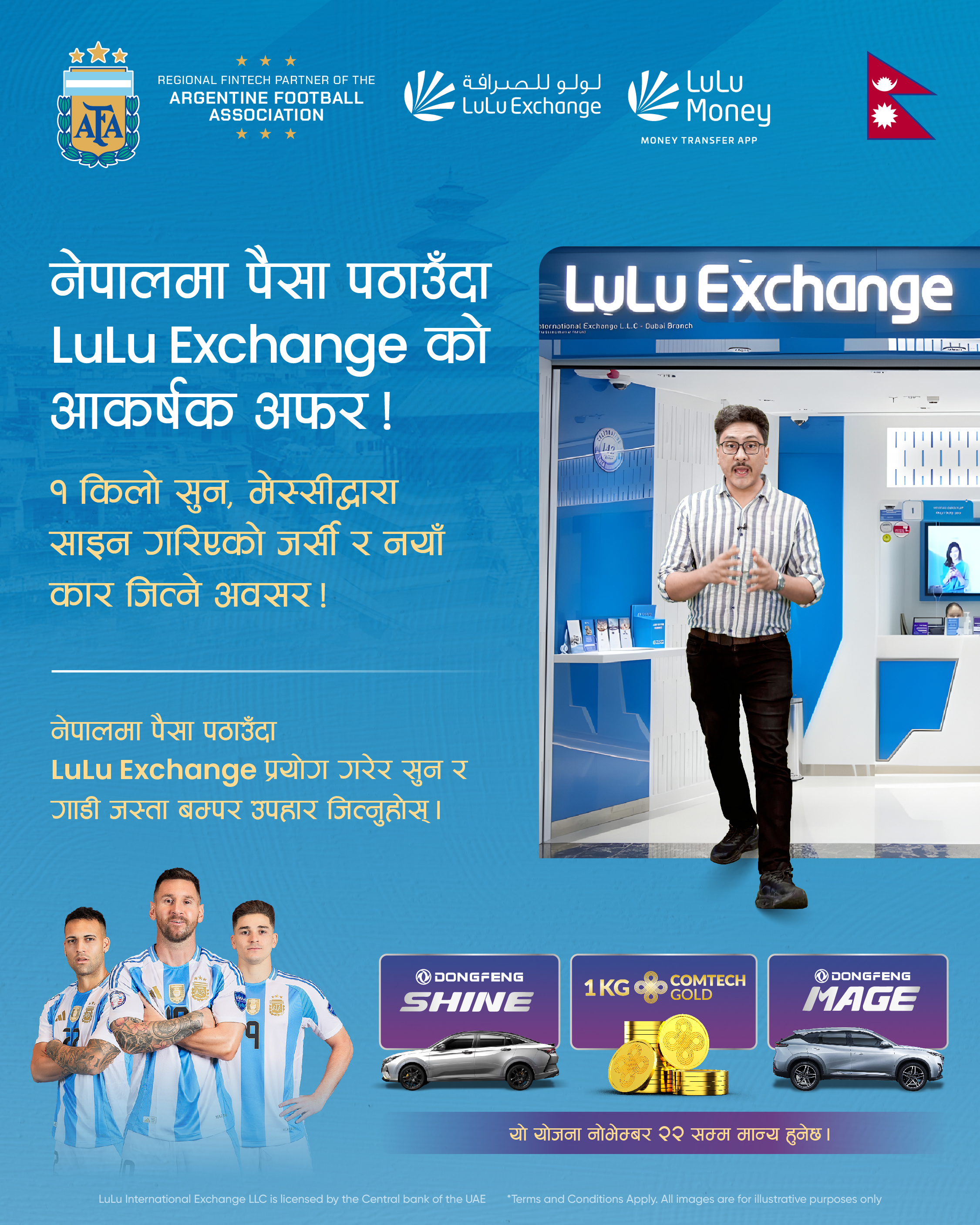 अफर अन्तर्गत युएईमा रहेका नेपालीहरूले लुलु एक्सचेन्जमार्फत नेपालमा पैसा पठाउँदा १ किलो सुन, दुईवटा मेगा पुरस्कार कार र फुटबल स्टार लियोनेल मेसीले हस्ताक्षर गरेको अर्जेन्टिनाको जर्सी जित्ने अवसर पाउनेछन्।
