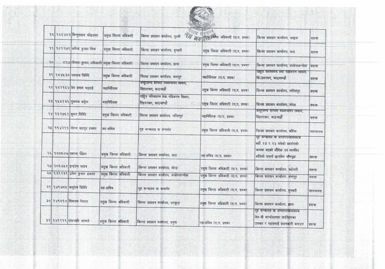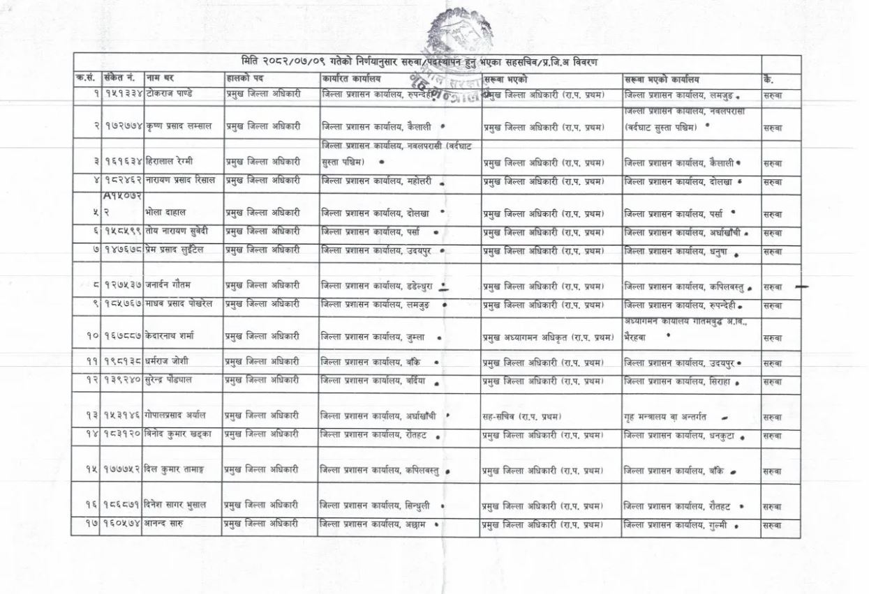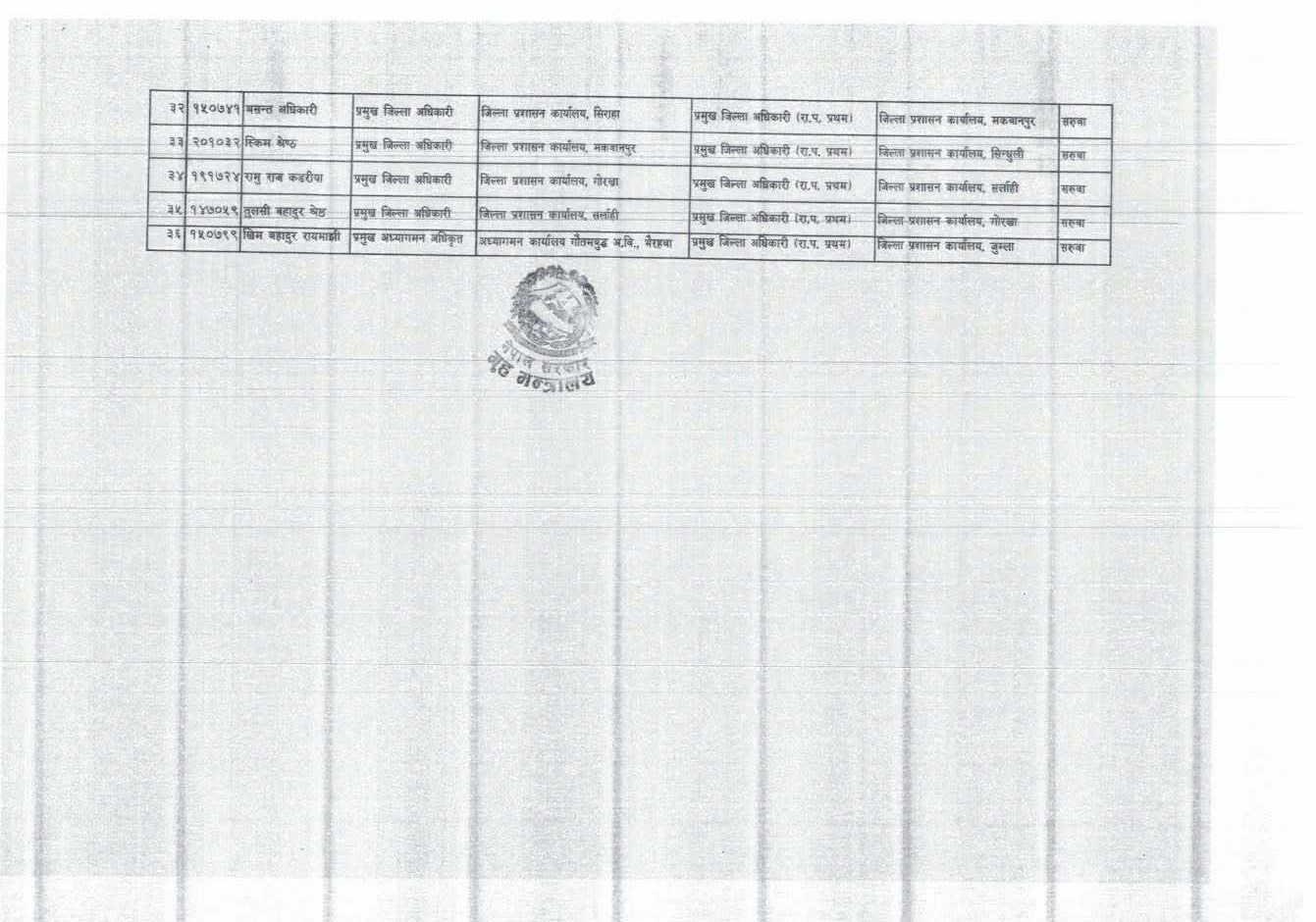 गृह मन्त्रालयले आइतबार ३६ जना सहसचिवको सरुवा गर्दै ललितपुर, रूपन्देही, डडेल्धुरा, गोरखा लगायत विभिन्न जिल्लाका प्रमुख जिल्ला अधिकारी (सिडिओ) हरूमा हेरफेर गरेको छ।