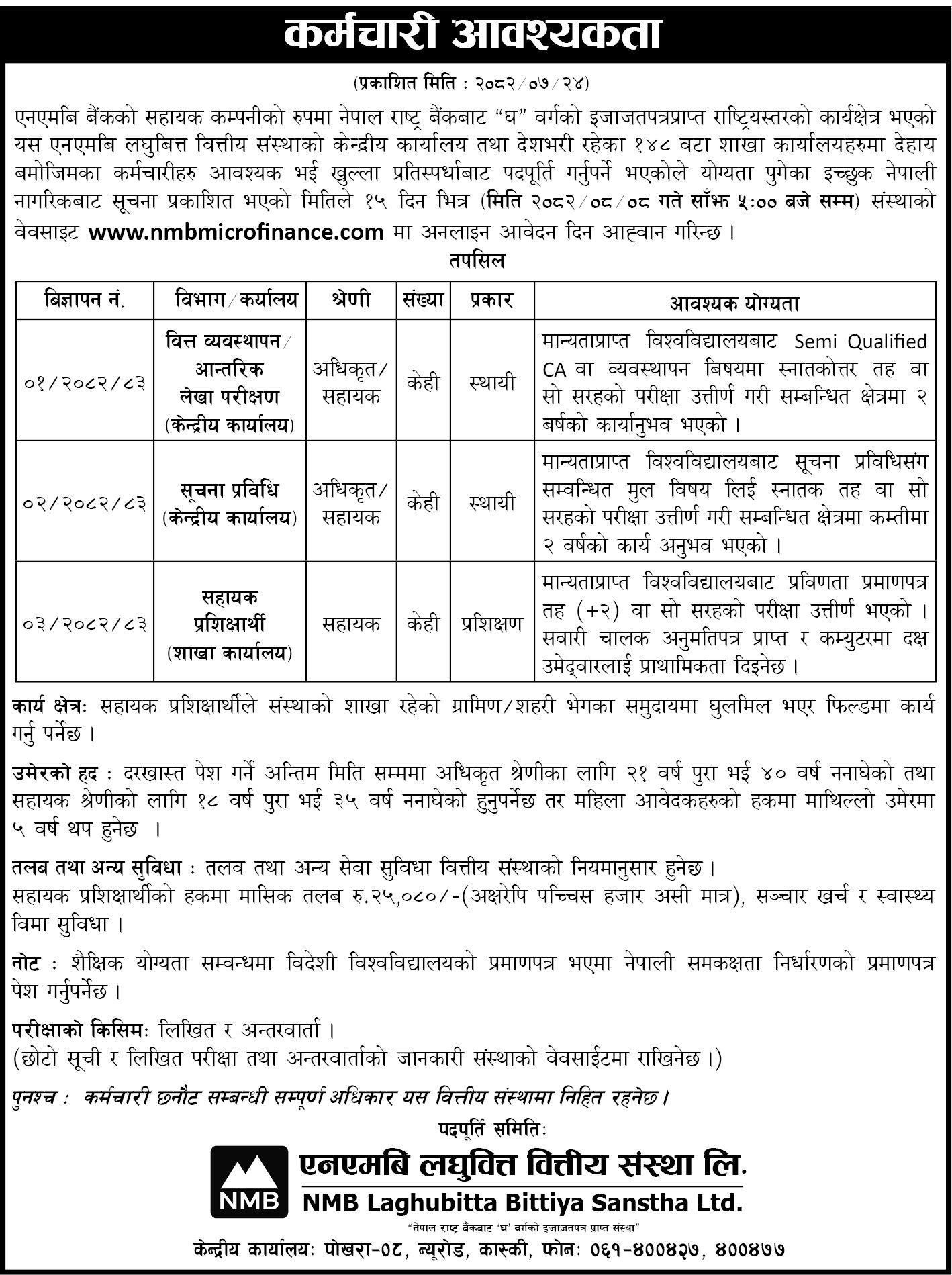 कम्पनीले वित्त ब्यवस्थापन आन्तरिक लेखा परीक्षण, सूचना प्रविधि र सहायक प्रशिक्षार्थीका लागि केहि संख्यामा कर्मचारी माग गरेको हो । जसका लागि शैक्षिक योग्यता प्रविणता प्रमाणपत्र तह पासदेखि स्नातकोत्तर उत्तिर्ण गरेको हुुनपर्नेछ । इच्छुक ब्यक्तिले आवश्यक कागजात संकलन गरी मंसिर ८ गतेसम्म कम्पनीको बेवसाइट https://nmb.com.np/career मार्फत आवेदन दिन सक्नेछन् ।