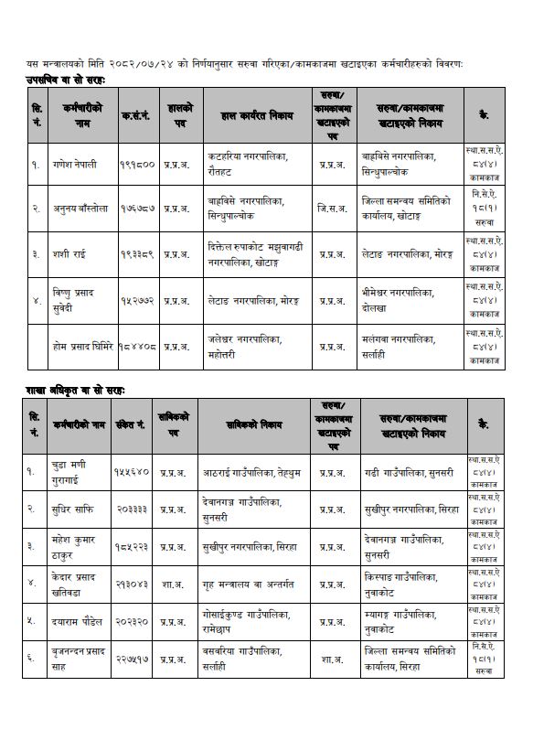 त्यस्तै, सर्लाहीको विष्णु गाउँपालिका, जाजरकोटको नलगाढ नगरपालिका, र रुपन्देहीको सियारी गाउँपालिकाका प्रमुख प्रशासकीय अधिकृतहरूको पनि सरुवा गरिएको छ। यससँगै जिल्ला समन्वय समिति सिरहासहित थप ६ जना अधिकृतहरूको समेत सरुवा भएको मन्त्रालयले जनाएको छ।