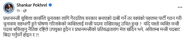 नेकपा एमालेका महासचिव शंकर पोखरेलले नयाँ दल गठन गरेर चुनावमा जाने घोषणा गरिसकेको व्यक्तिलाई मन्त्री पदमा राखिराख्नु उचित नहुने बताएका छन्। तीनवटा मन्त्रालय सम्हालिरहेका मन्त्री कुलमान घिसिङतर्फ संकेत गर्दै उनले शुक्रबार सामाजिक सञ्जाल फेसबुकमार्फत् यस्तो टिप्पणी गरेका हुन्।