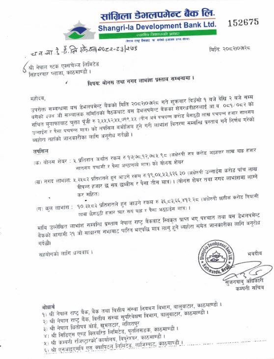 सांग्रिला डेभलपमेन्ट बैंकले लाभांश घोषणा गरेको छ। बैंकको कार्तिक २८ गते बसेको संचालक समितिको बैठकले आर्थिक वर्ष २०८८१/८२ को मुनाफाबाट वितरण गर्ने लाभांश घोषणा गरेको हो ।