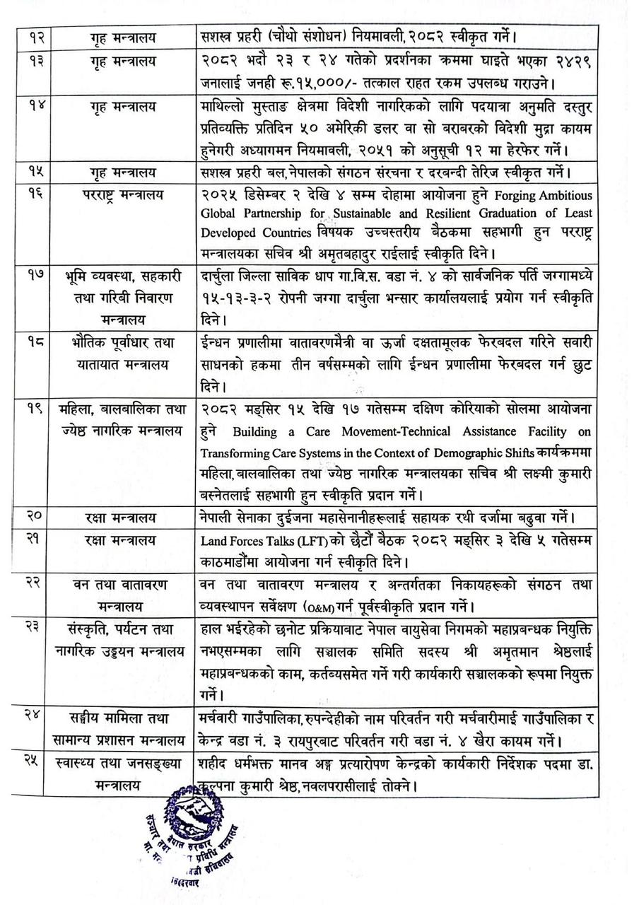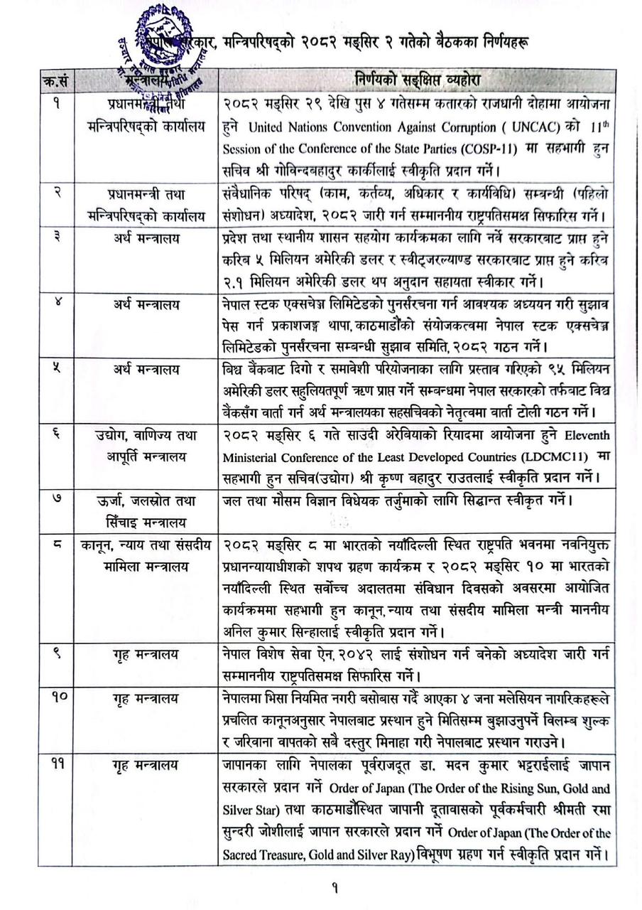 मंगलबार बसेको मन्त्रिपरिषद्ले गरेका निर्णय आज सार्वजनिक गरिएको छ । बुधबार सञ्चार मन्त्रालयमा आयोजित पत्रकार सम्मेलनमा सरकारका प्रवक्ता समेत रहेका सूचना तथा सञ्चार प्रविधिमन्त्री जगदीश खरेलले मन्त्रिपरिषद्ले गरेका २५ निर्णय सार्वजनिक गरेका हुन् ।