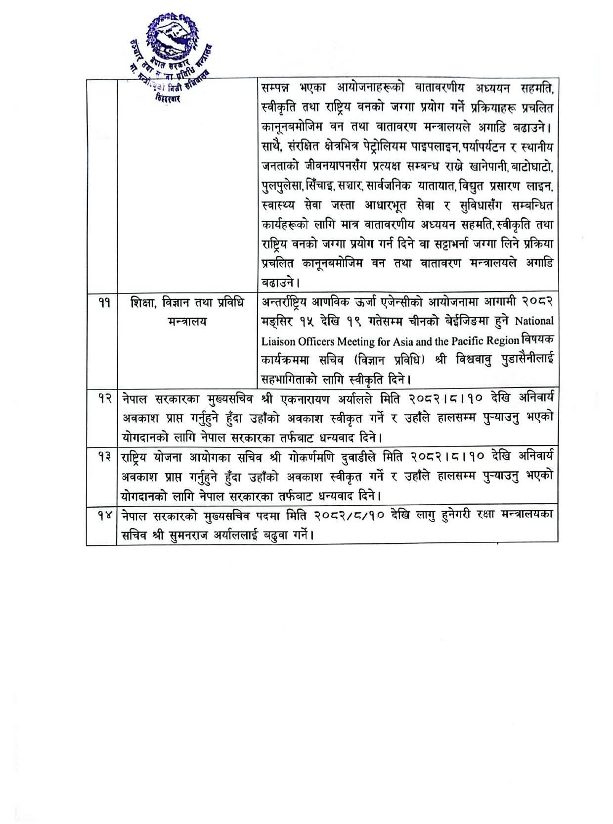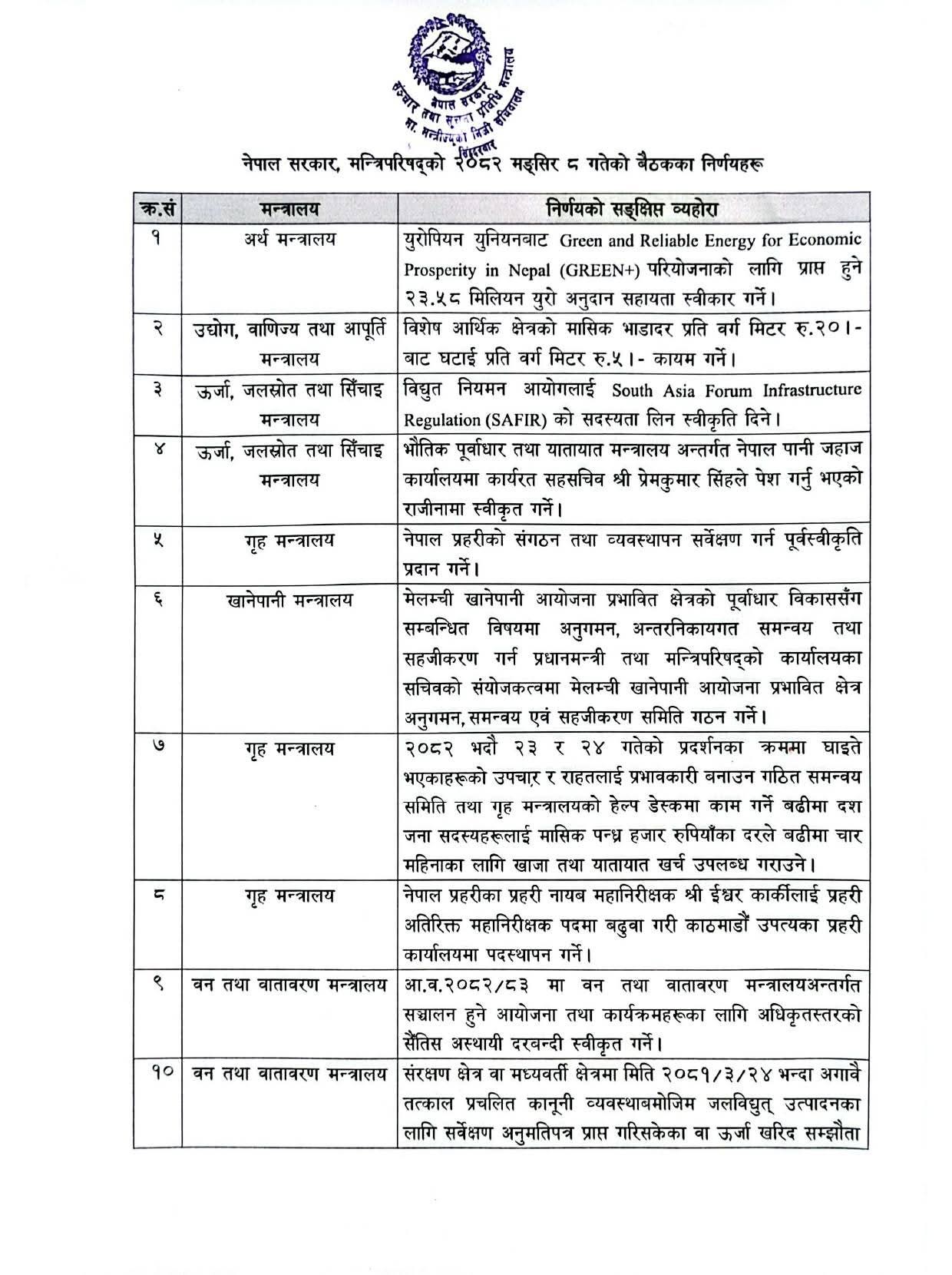 सरकारले पछिल्लोपटक बसेको मन्त्रिपरिषद् बैठकका निर्णय सार्वजनिक गरेको छ । सोमबार प्रधानमन्त्री तथा मन्त्रिपरिषद् कार्यालयमा मन्त्रिपरिषद् बैठक बसेको थियो । उक्त बैठकले गरेको निर्णय सरकारका प्रवक्ता एवं सञ्चार, सूचना तथा प्रविधिमन्त्री जगदीश खरेलले जानकारी दिए ।