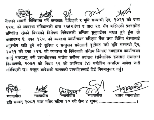 बैंक तथा वित्तीय संस्थाहरुले कर्जा असुलीको क्रममा सकार गरी आफ्ना नाममा दर्ता कायम गरेको गैरबैंकिङ सम्पत्ति ३ बर्ष भित्रमा बेचबिखन गर्नु पर्ने र उक्त अवधी भित्र बेचबिखन नगरेमा नेपाल सरकारको स्वीकृति लिएर मात्र बेचबिखन गर्न पाउने भूमि सम्बन्धी ऐन, २०२१ को दफा १२ ‘च’ को संशोधित व्यवस्था कार्यान्वयन नगर्न सर्वोच्च अदालतको संवैधानिक ईजलासले नेपाल सरकारका नाममा अन्तरिम आदेश जारी गरेको छ ।
