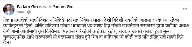आज फेसबुकमा स्टाटस लेख्दै पूर्वमन्त्री गिरीले पार्टी अध्यक्ष केपी शर्मा ओलीमाथि नै षड्यन्त्र भइरहेको उल्लेख गरेका छन् ।