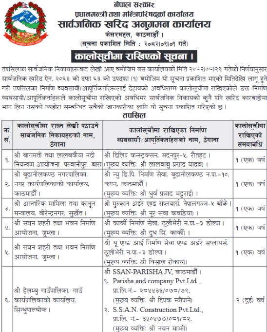 यसैगरी, काठमाडौँको बबरमहलस्थित तुलसीराम कोजुको कम्पनी कुजु कन्स्ट्रक्सनलाई दार्चुलाको मार्मा गाउँपालिकाको सिफारिसमा कालोसूचीमा राखिएको हो। लालबाबु प्रसाद यादवको स्वामित्वमा रहेको दिलिप कन्स्ट्रक्सनलाई भने बाराको परवानीपुरस्थित बागमती तथा लालबकैया नदी नियन्त्रण आयोजनाको सिफारिसमा कारबाही गरिएको कार्यालयले जनाएको छ।