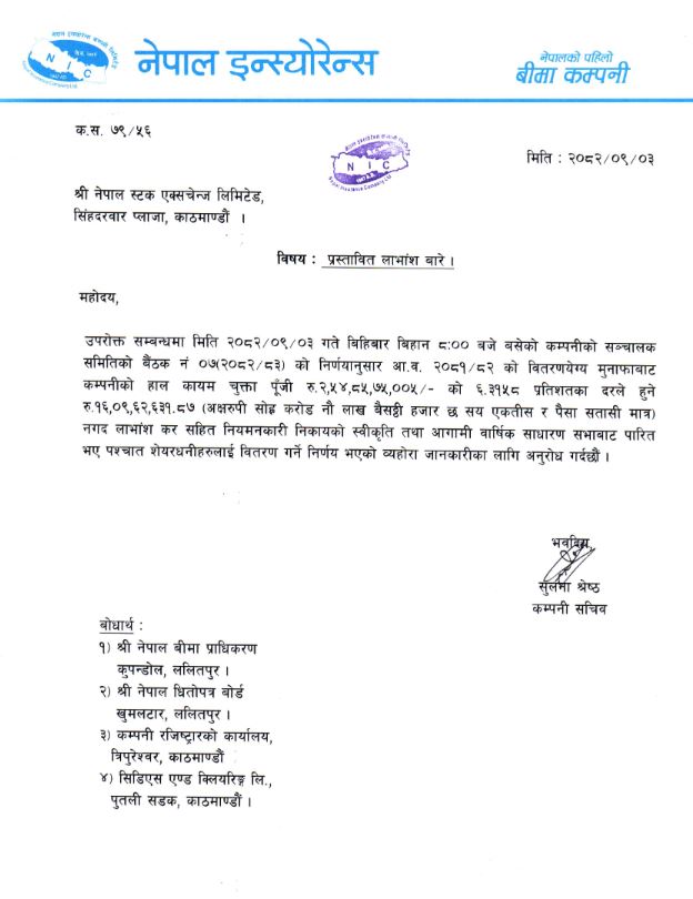 यो निर्णय नेपाल बीमा प्राधिकरणबाट स्वीकृत भई कम्पनीको अब हुने वार्षिक साधारणसभाले पारित गरेपछि शेयरधनीहरूमा वितरण गरिनेछ।