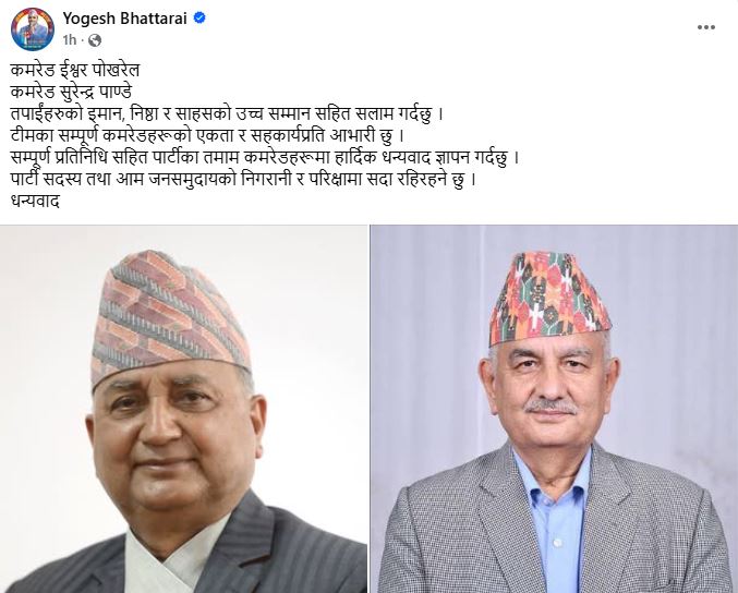पोखरेल अध्यक्षमा ओलीसँग र पाण्डे महासचिवमा पाख्रेलसँग पराजित भएका छन् । पोखरेलकै प्यानलबाट नेता भट्टराई उपमहासचिवमा विजयी भएका छन् । उनले आफ्नो विजयका लागि प्रतिनिधिहरूलाई धन्यवाद दिँदै पार्टी सदस्य तथा आम जनताको निगरानी र परीक्षामा सधैं रहिरहने उल्लेख गरेका छन् ।