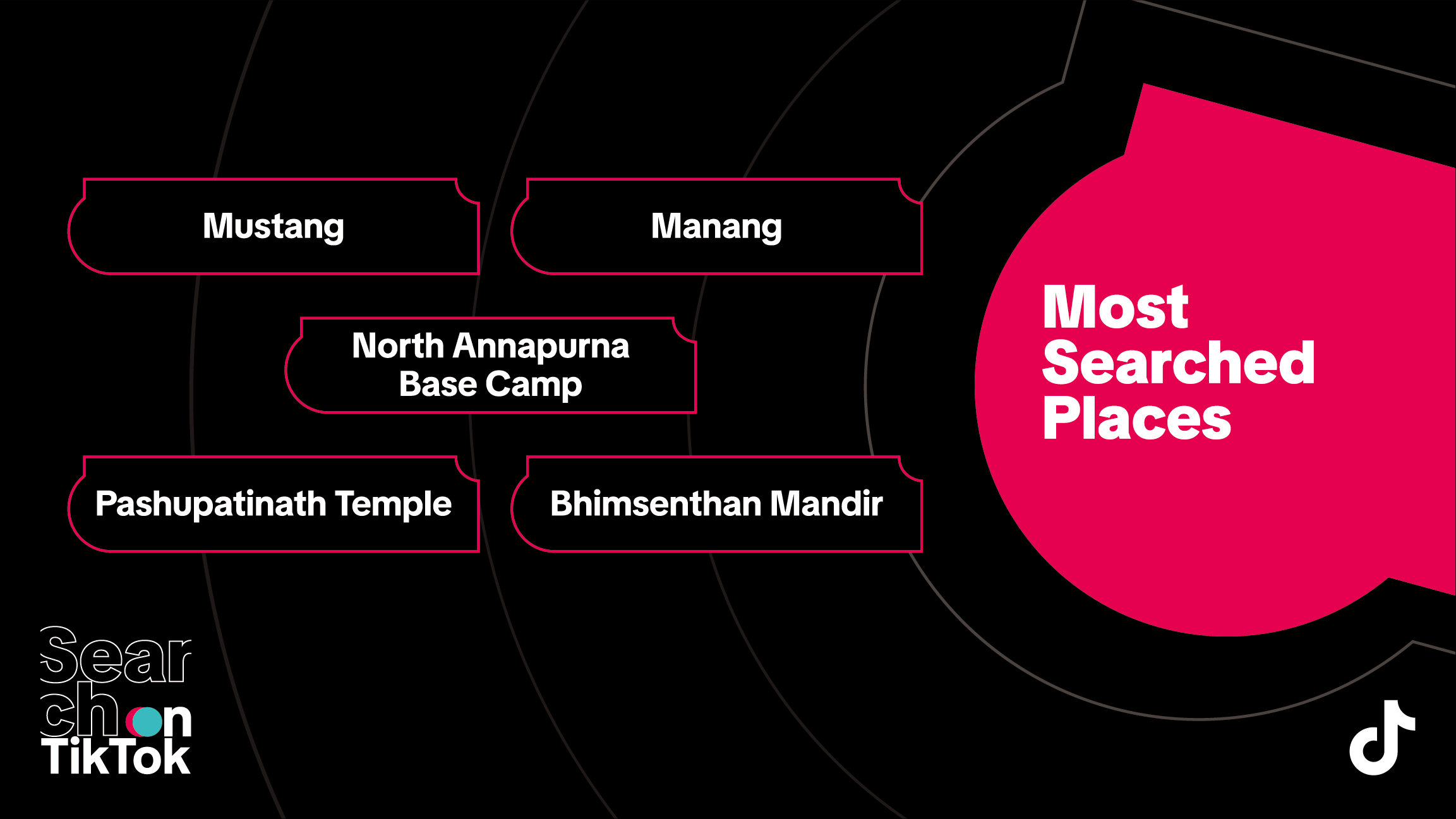 यस वर्षका सर्चहरूले उद्देश्य सहितका खोजको कथा भनिरहेका छन्। यात्राका लागि महत्त्वपूर्ण गन्तव्यहरूमा देखिएको चासोले टिकटकले गन्तव्य खोज्न, घुमफिरको योजना बनाउन र नयाँ अनुभवहरू पत्ता लगाउन भूमिका खेलिरहेको देखाउँछ। यो सूचीले लोकप्रिय सेलिब्रिटी र ड्रामादेखि लिएर दैनिक कुराकानीलाई प्रभाव पार्ने गीत र भाइरल क्षणहरूसम्म, समग्रमा नेपाली संस्कृतिको ढुकढुकी नै समेटेको छ।