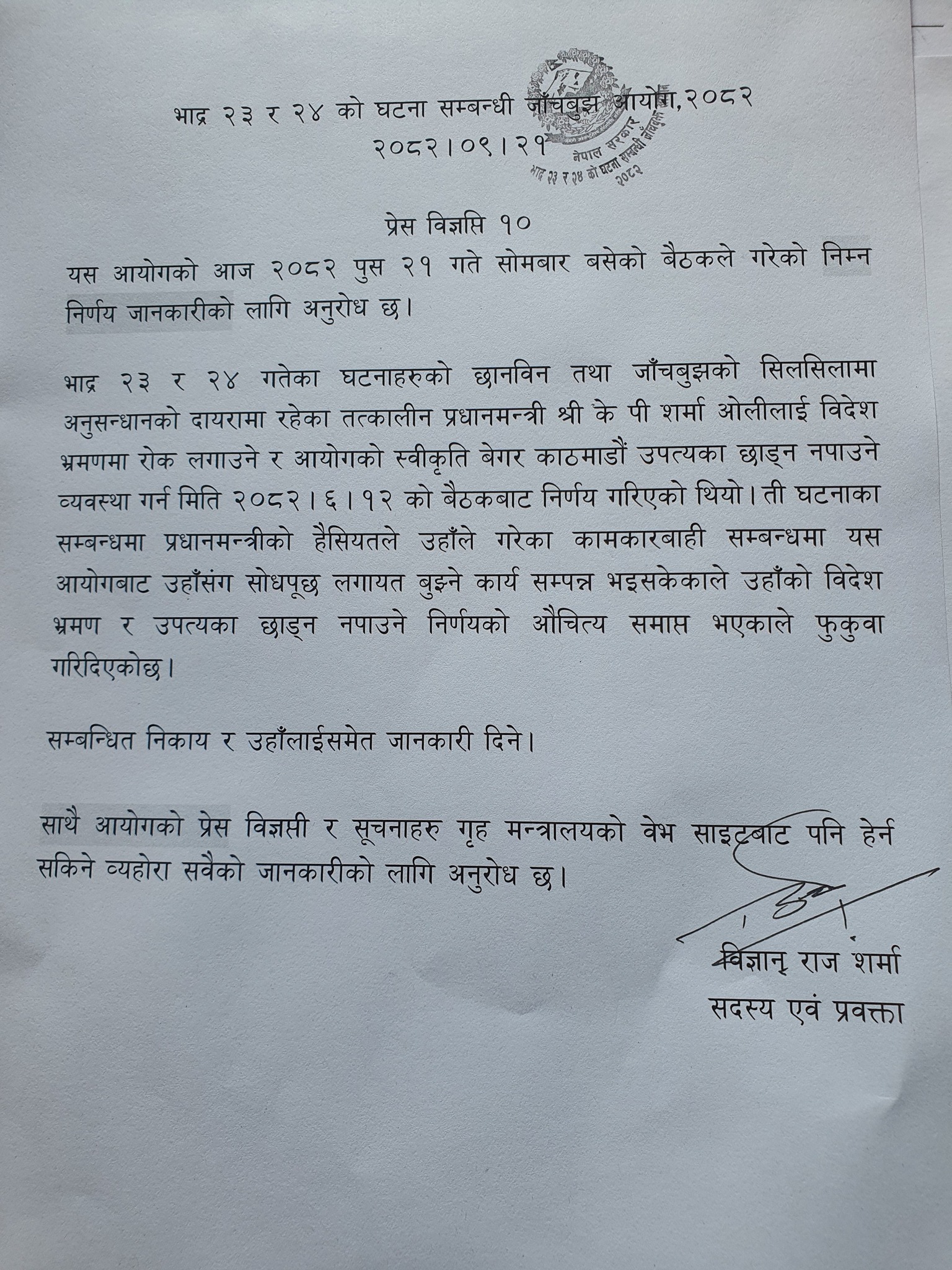 प्रवक्ता विज्ञानराज शर्माद्वारा जारी विज्ञप्तिमा त्यसताका भएका घटनाको जाँचबुझ तथा छानबिनको सिलसिलामा तत्कालीन प्रधानमन्त्री ओलीलाई विदेश भ्रमणमा रोक र अनुमतिबेगर काठमाडौं उपत्यका छाड्न नपाउने गरी असोज १२ मा निर्णय गरिएकोमा सोधपुछलगायत बुझ्ने कार्य सकिएकाले उक्त निर्णयको औचित्य समाप्त भइसकेको भन्दै फुकुवा गरिएको उल्लेख छ ।