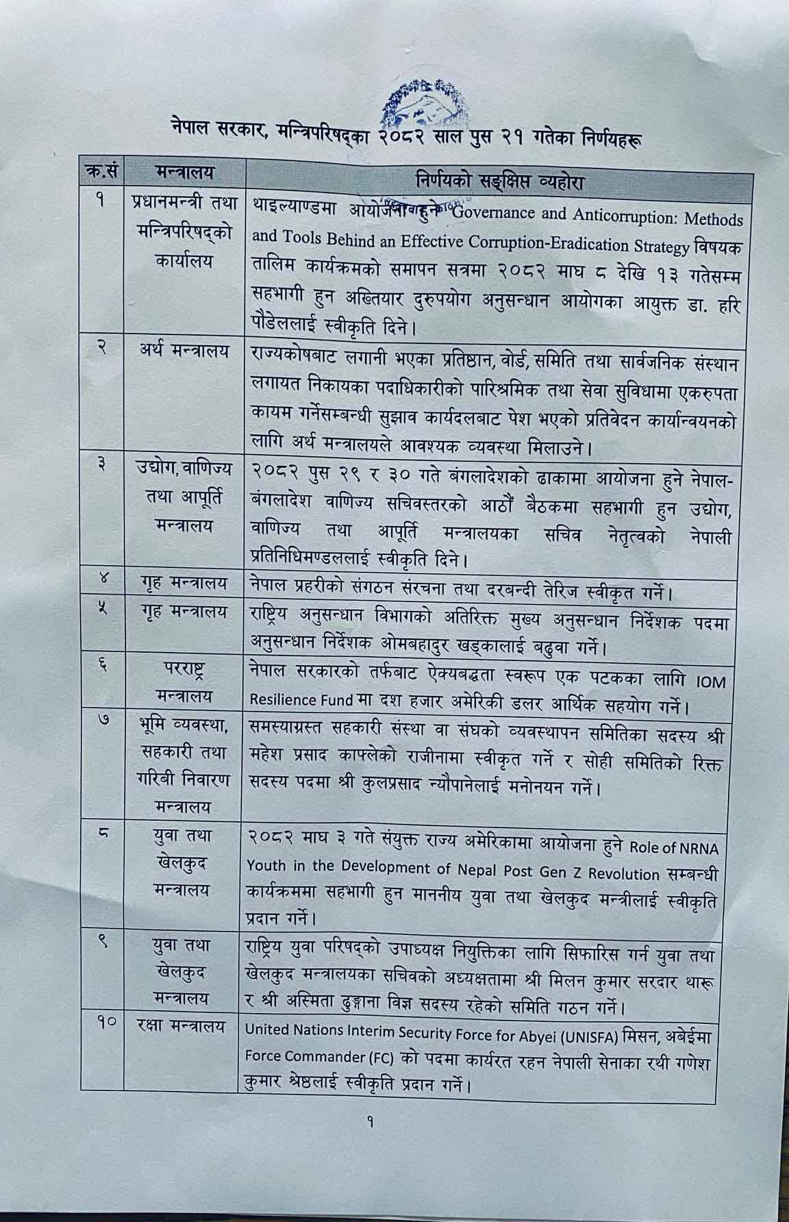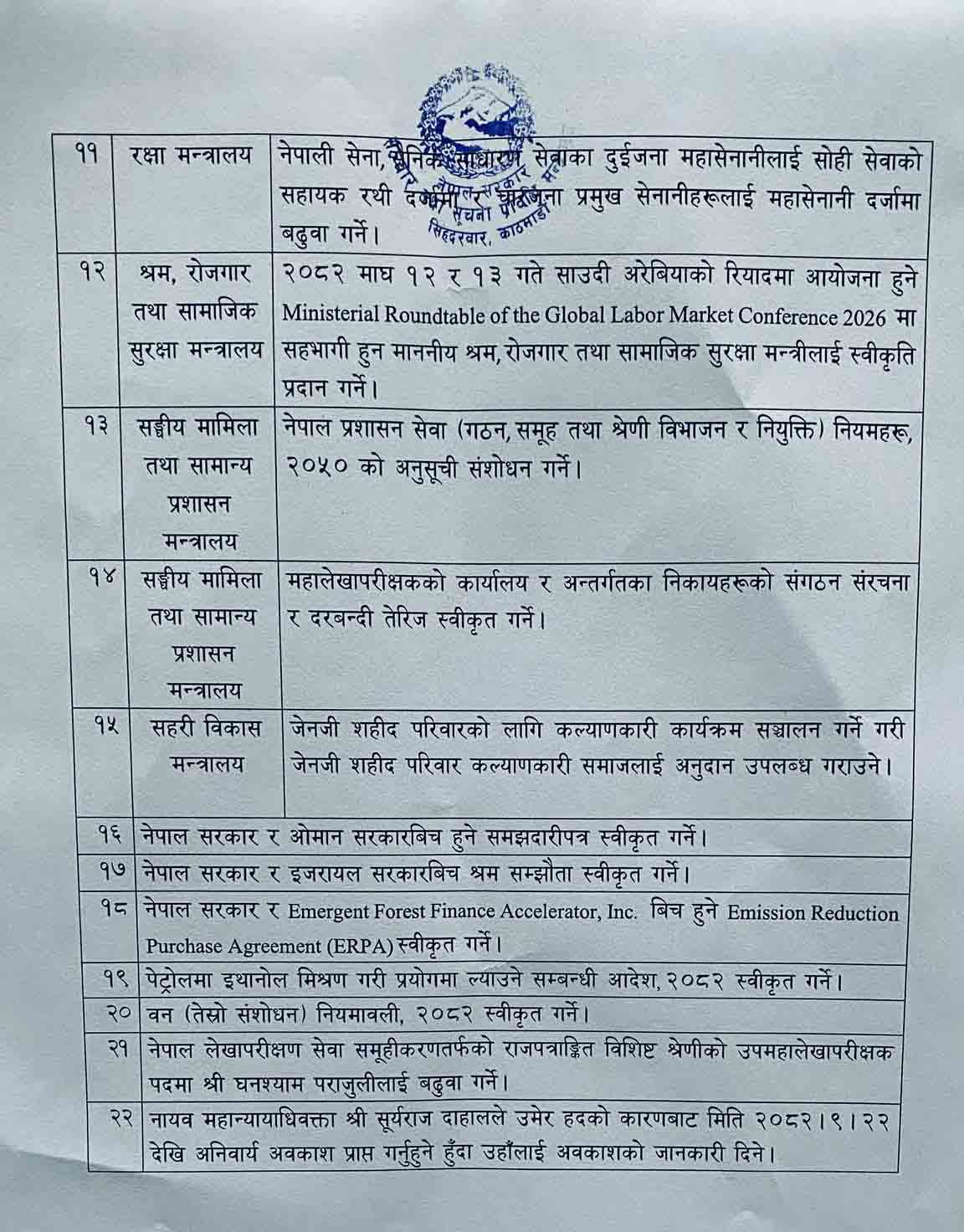 सरकारले मन्त्रिपरिषद् बैठकका निर्णय सार्वजनिक गरेको छ। मंगलबार पुष ११ र २१ गते बसेको मन्त्रिपरिषद्का ३५ निर्णय सार्वजनिक भएका हुन् ।