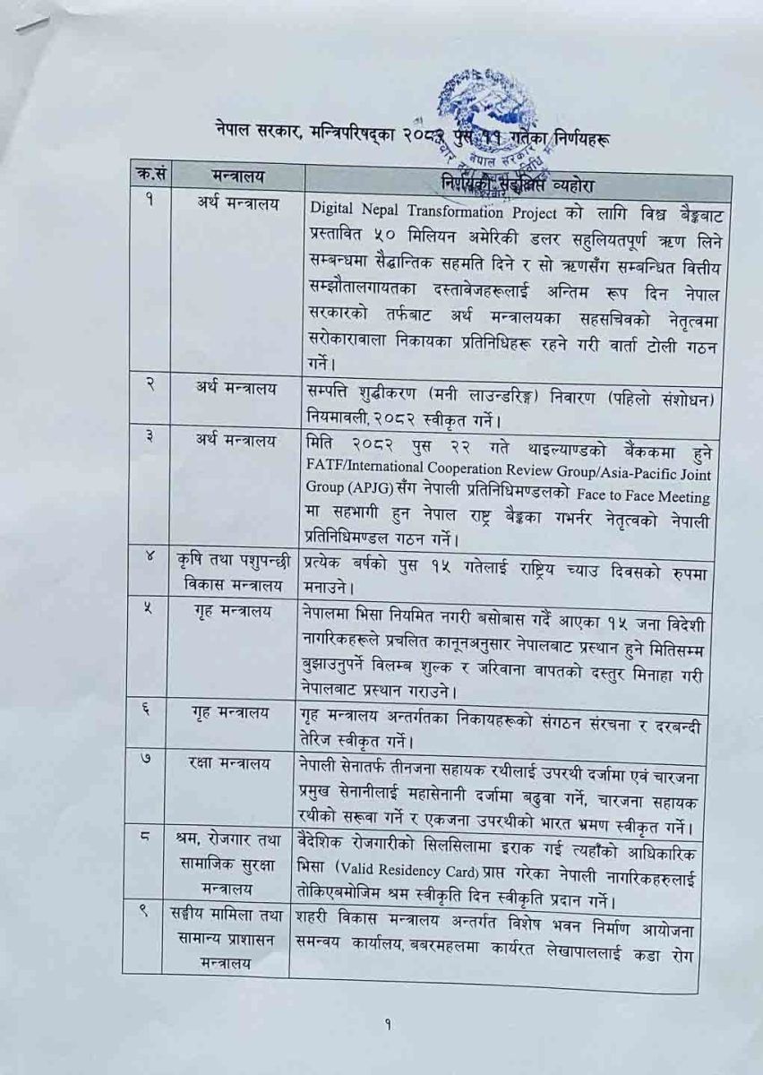 डिजिटल नेपाल ट्रान्सफरमेसन प्रोजेक्टका लागि विश्व बैंकबाट प्रस्तावित ५० मिलियन अमेरिकी डलर सहुलियतपूर्ण ऋण लिने सम्बन्धमा सैद्धान्तिक सहमति दिने, प्रत्येक वर्षको पुस १५ लाई च्याउ दिवसका रूपमा मनाउने, नोपल प्रहरीको संगठन संरचना तथा दरबन्दी तेरिज स्वीकृति दिने लगायतका निर्णय भएको सरकारका प्रवक्ता एवम् सञ्चार तथा सूचना प्रविधिमन्त्री जगदीश खरेलले जानकारी दिए ।