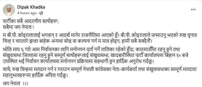 नेपाली कांग्रेसका नेता दीपक खड्काले पार्टीको चुनाव चिह्न रुख र चारतारे झण्डाबाहेक अन्य कुनै विकल्पको कल्पना गर्न नसक्ने बताएका छन्। उनले सोमबार बिहान सामाजिक सञ्जाल फेसबुकमार्फत बीपी कोइरालाले जन्माएको रुख चुनाव चिह्न र चारतारे झण्डाबाहेक अरू सोच्न नसकिने उल्लेख गरेका हुन्।