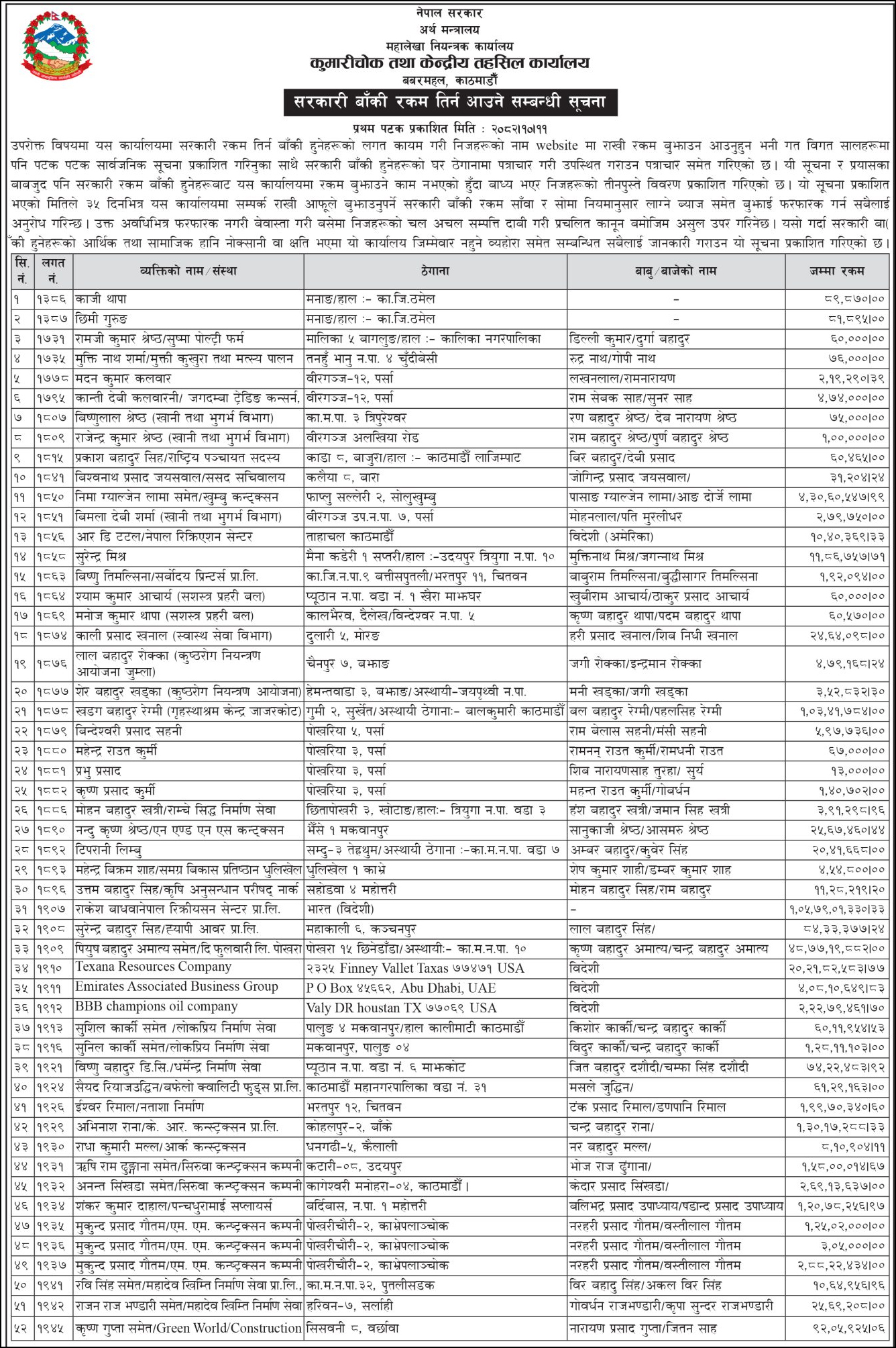 सरकारलाई लामो समयदेखि बुझाउनुपर्ने रकम नबुझाएका ५२ व्यक्तिको तीन पुस्तासम्मको विवरण सार्वजनिक गरिएको छ। महालेखा नियन्त्रकको कार्यालय मातहत कुमारी चोक तथा केन्द्रीय तहसिल कार्यालय बबरमहलले विभिन्न पेशा र क्षेत्रसँग सम्बन्धित व्यक्तिहरूको सूची सार्वजनिक गरेको हो। सार्वजनिक सूचीमा व्यवसायी, सरकारी तथा निजी क्षेत्रका कर्मचारी, कृषि पेशामा संलग्न व्यक्ति र सशस्त्र प्रहरीसमेत परेका छन्।
