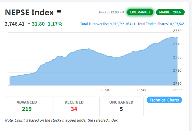 सेयर कारोबार हुने पहिलो दिनको पहिलो एक घण्टामा नेप्से परिसूचक १.१७ प्रतिशतले बढेको छ । आइतबारको पहिलो एक घण्टाको कारोबार जारी रहँदा परिसूचक ३१.८० अंकले बढेर २७४६.४१ विन्दुमा पुगेको हो ।