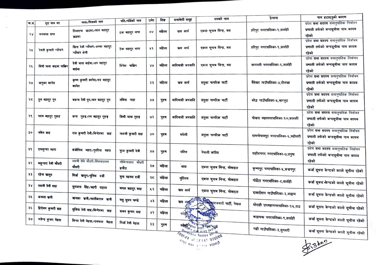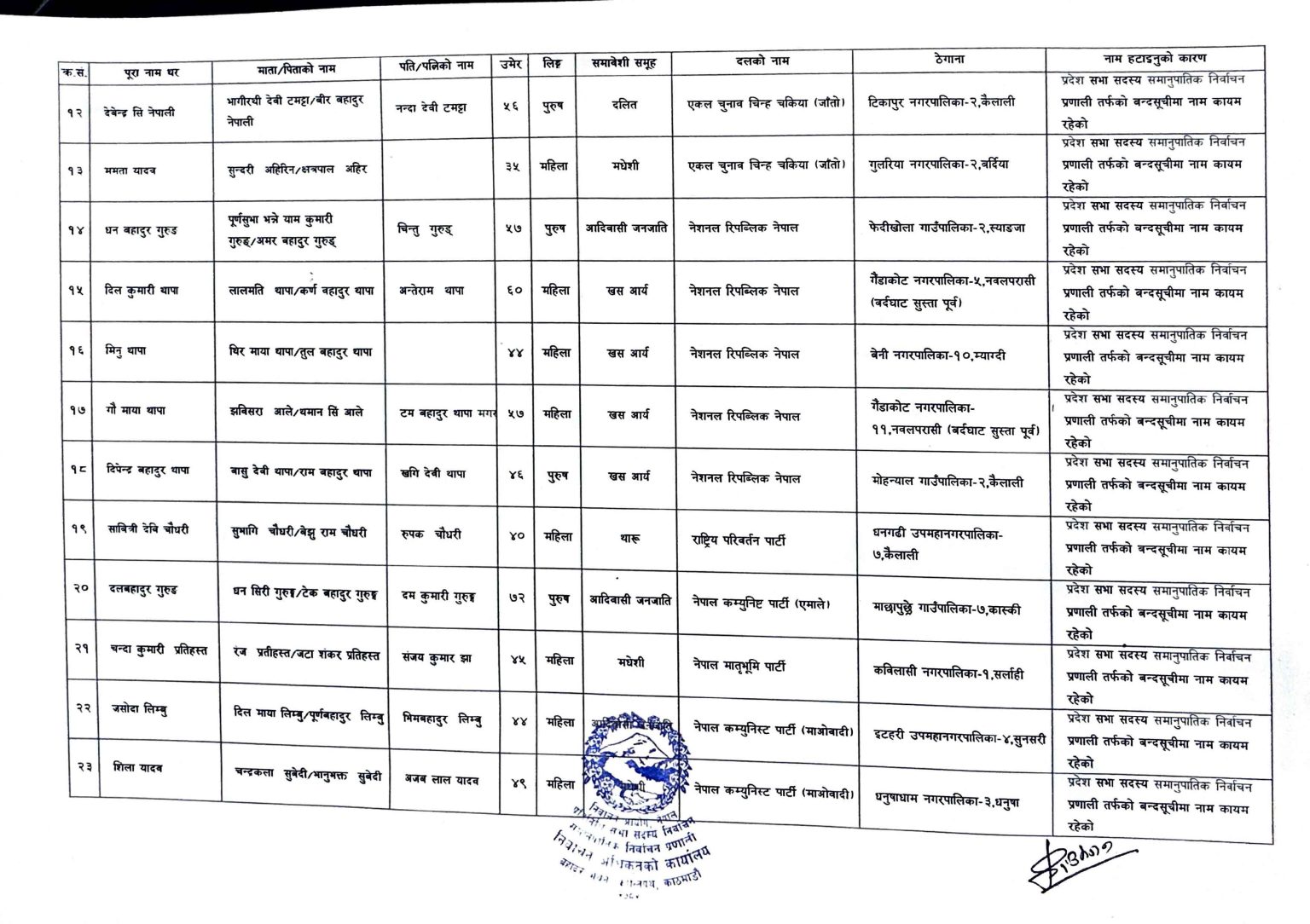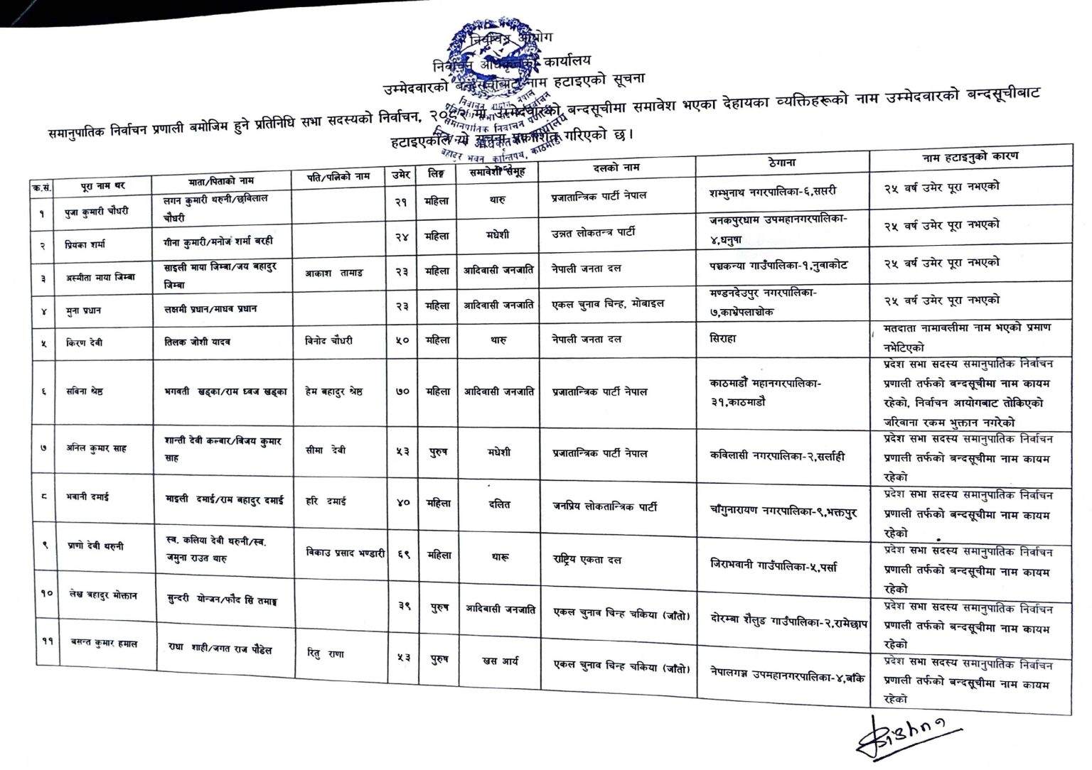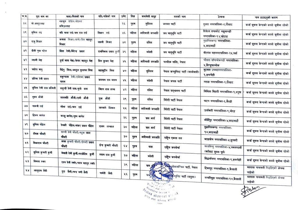 यसैगरी, महिला उम्मेदवार पेस हुनुपर्ने स्थानमा पुरूष उम्मेदवार पेस गरिएका कारण एक जनाको नाम हटाइएको छ । सम्बन्धित राजनीतिक दलकै आग्रहमा १० जनाको नाम बन्दसूचीबाट हटाइएको आयोगले जनाएको छ ।