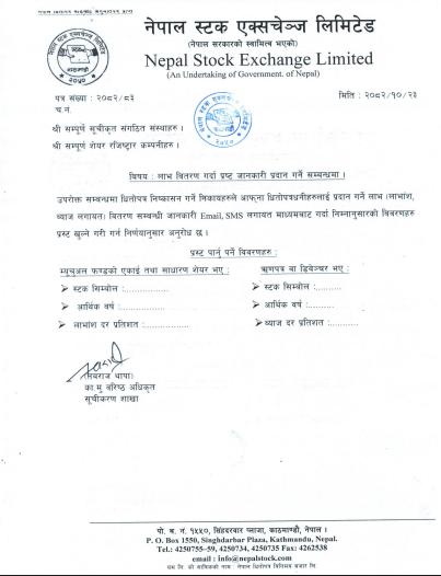 नेपाल स्टक एक्सचेन्ज नेप्सेले लाभ वितरण गर्दा प्रष्ट जानकारी प्रदान गर्न सम्पूर्ण सूचीकृत कम्पनीहरुलाई निर्देशन दिएको छ। धितोपत्र निष्कासन गर्ने निकायहरुले आफ्ना धितोपत्रधनीहरुलाई प्रदान गर्ने लाभ (लाभांश, ब्याज लगायत) वितरण सम्बन्धी जानकारी इमेल, एसएमएस लगायत माध्यमबाट प्रदान गर्न नेप्सेले निर्देशन दिएको हो ।