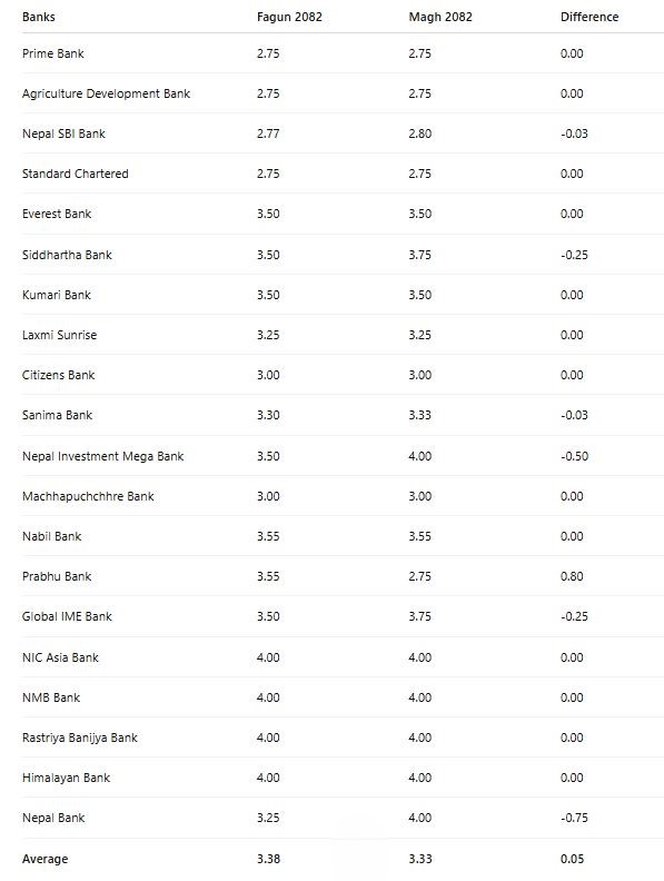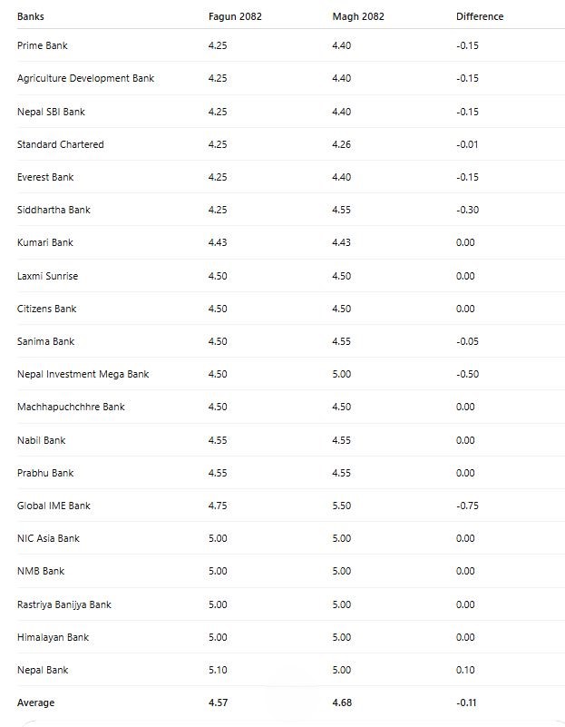 वाणिज्य बैंकहरूले फागुन महिनादेखि लागू हुने नयाँ ब्याजदर सार्वजनिक गरेका छन्। बैंकहरूले जारी गरेको विवरणअनुसार अधिकांश बैंकले ब्याजदर घटाएका छन्। व्यक्तिगत मुद्दति निक्षेपतर्फ हेर्दा फागुन महिनामा अधिकतम औसत ब्याजदर घटेको देखिन्छ। माघ महिनामा ४.६८ प्रतिशतमा रहेको यस्तो ब्याजदर फागुनमा ०.११ प्रतिशत बिन्दुले घटेर ४.५६ प्रतिशतमा झरेको हो।