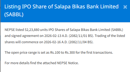 सूचीकृत भएको सो आईपीओ अव सोमबारदेखि कारोबारमा आउने भएको छ । सो कम्पनीले सर्वसाधारण सेयरधनीको लागि ३३ प्रतिशत र संस्थापक सेयरधनीको लागि ६७ प्रतिशत सेयर सूचीकृत भएको छ । कम्पनीको ओपनिङ रेन्ज १०० रुपैयाँ देखि ३०० रुपैयाँ तोकिएको छ ।