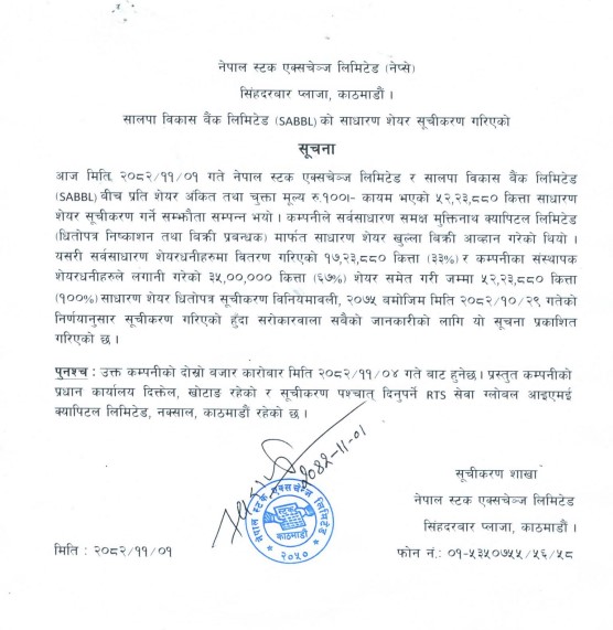 सालपा विकास बैंक लिमिटेडको साधारण सेयर (आईपीओ) सूचीकृत भएको छ । शुक्रबार नेपाल स्टक एक्सचेन्ज (नेप्से) मा सो कम्पनीको ५२ लाख २३ हजार ८८० कित्ता सेयर सूचीकृत भएको हो ।