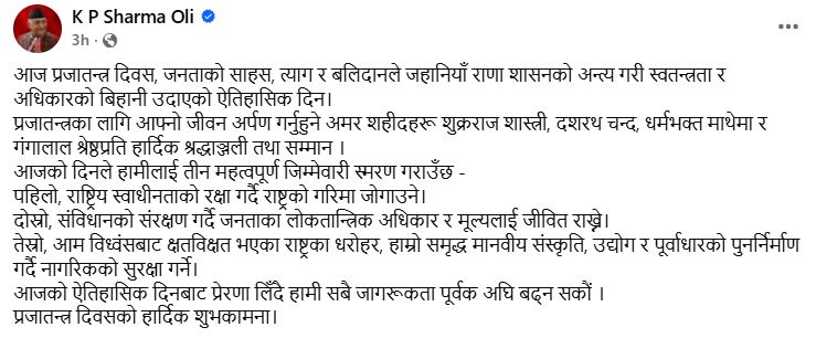 केपी शर्मा ओलीले प्रजातन्त्र दिवसको अवसरमा शुभकामना व्यक्त गर्दै वर्तमान अवस्थामा तीन महत्वपूर्ण जिम्मेवारीप्रति सचेत रहन आवश्यक रहेको बताएका छन्।