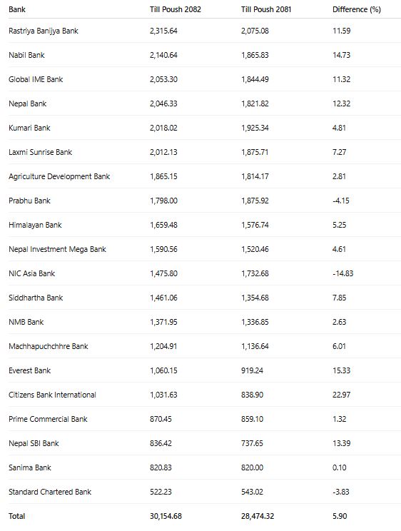 चालु आर्थिक वर्ष २०८२/८३ को दोस्रो त्रैमाससम्म वाणिज्य बैंकहरूले कर्मचारीको तलब भत्तामा ३० अर्ब रुपैयाँ भन्दा बढी खर्च गरेका छन्। नेपाल राष्ट्र बैंकले सार्वजनिक गरेको तथ्यांकअनुसार २० वटा वाणिज्य बैंकले पुस मसान्तसम्म कुल ३० अर्ब १५ करोड ४६ लाख रुपैयाँ खर्च गरेका हुन्।