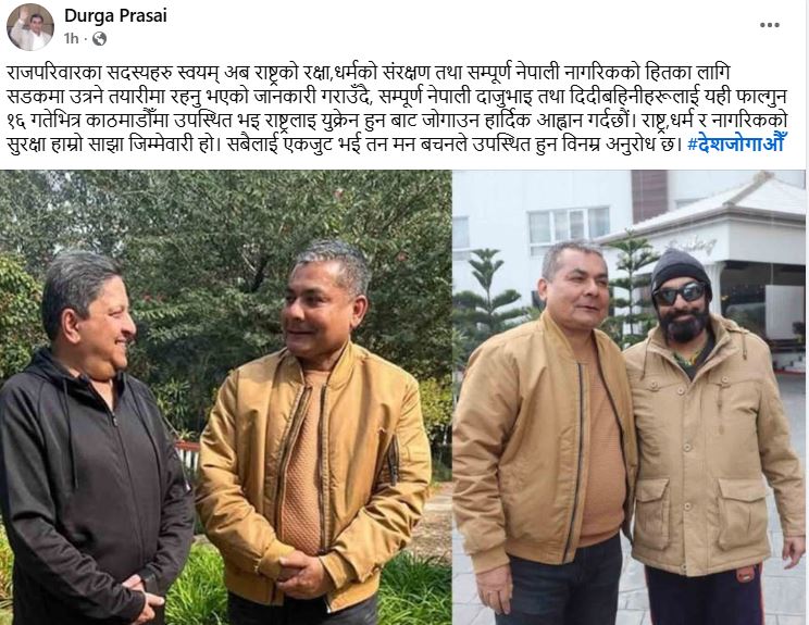 राजावादी अभियन्ता तथा व्यवसायी दुर्गा प्रसाईंले फागुन १६ गतेभित्र काठमाडौंमा उपस्थित हुन देशभरका सर्वसाधारणलाई अपिल गरेका छन् । राजपरिवारका सदस्यहरु स्वयम् सडकमा उत्रिने तयारीमा रहेको उनको दावी छ । सामाजिक सञ्जालमा स्टाटस लेख्दै प्रसाईंले यस्तो दावी गरेका हुन् ।