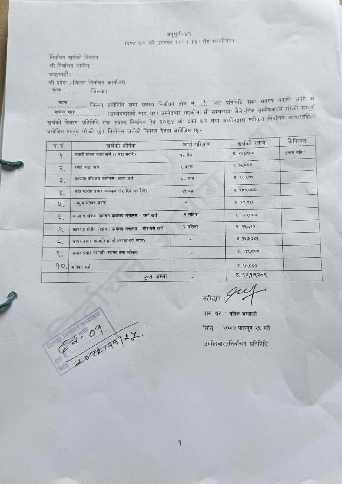 रास्वपाका वरिष्ठ नेता बालेन साहले झापा–५ बाट निर्वाचित भएपछि आफ्नो चुनावी खर्च विवरण निर्वाचन आयोगमा बुझाएका छन्।