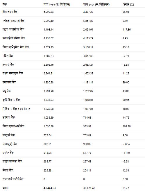उक्त अवधिमा १४ वाणिज्य बैंकमा गैरबैंकिङ सम्पत्ति बढेको छ भने ५ बैंकमा घटेको छ। प्राइम कमर्सियल बैंक र नेपाल एसबीआई बैंकमा यसको वृद्धि उच्च देखिएको छ। कुमारी बैंक, माछापुच्छ्रे बैंक, एभरेष्ट बैंक र राष्ट्रिय वाणिज्य बैंकले भने यस्तो सम्पत्ति घटाउन सफल भएका छन्। माघसम्मको तथ्यांकअनुसार सबैभन्दा धेरै गैरबैंकिङ सम्पत्ति हिमालयन बैंकमा रहेको छ। जहाँ ६ अर्ब ९ करोड ९८ लाख रुपैयाँ बराबर पुगेको छ। अघिल्लो वर्षको तुलनामा यो ३५.९४ प्रतिशतले वृद्धि हो। त्यसपछि ग्लोबल आइएमई बैंकमा ५ अर्ब ९९ करोड ४ लाख रुपैयाँ र प्राइम कमर्सियल बैंकमा ४ अर्ब ४० करोड ५४ लाख रुपैयाँ बराबरको गैरबैंकिङ सम्पत्ति रहेको छ, जुन क्रमशः २.१९ प्रतिशत र ११७.५६ प्रतिशतले बढेको हो।