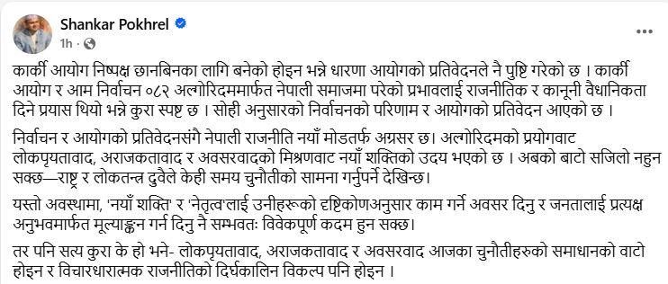 उनले लेखेका छन् ,‘कार्की आयोग र आम निर्वाचन ०८२ अल्गोरिदममार्फत नेपाली समाजमा परेको प्रभावलाई राजनीतिक र कानूनी वैधानिकता दिने प्रयास थियो भन्ने कुरा स्पष्ट छ,’ महासचिव पोखरेलले भनेका छन्, ‘सोही अनुसारको निर्वाचनको परिणाम र आयोगको प्रतिवेदन आएको छ ।अल्गोरिदमको प्रयोगबाट लोकप्रियतावाद, अराजकतावाद र अवसरवादको मिश्रणबाट नयाँ शक्तिको उदय भएको छ । अबको बाटो सजिलो नहुन सक्छ– राष्ट्र र लोकतन्त्र दुवैले केही समय चुनौतीको सामना गर्नुपर्ने देखिन्छ। तर पनि सत्य कुरा के हो भने– लोकप्रियतावाद, अराजकतावाद र अवसरवाद आजका चुनौतीहरुको समाधानको बाटो होइन र विचारधारात्मक राजनीतिको दीर्घकालीन विकल्प पनि होइन ।'