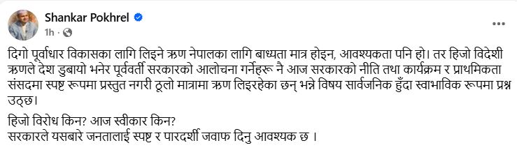 मंगलबार फेसबुकमा एक टिप्पणी लेख्दै महासचिव पोखरेलले दिगो पूर्वाधार विकासका लागि विदेशी ऋण लिनु नेपालको बाध्यता र आवश्यकता दुवै भएको यथार्थलाई भने स्वीकार गरेका छन् । तर, पूर्ववर्ती सरकारले ऋण लिँदा तीव्र विरोध गर्नेहरूले नै अहिले संसदमा स्पष्ट नीति र प्राथमिकतासमेत नराखी ऋण लिइरहेको उनको भनाइ छ ।