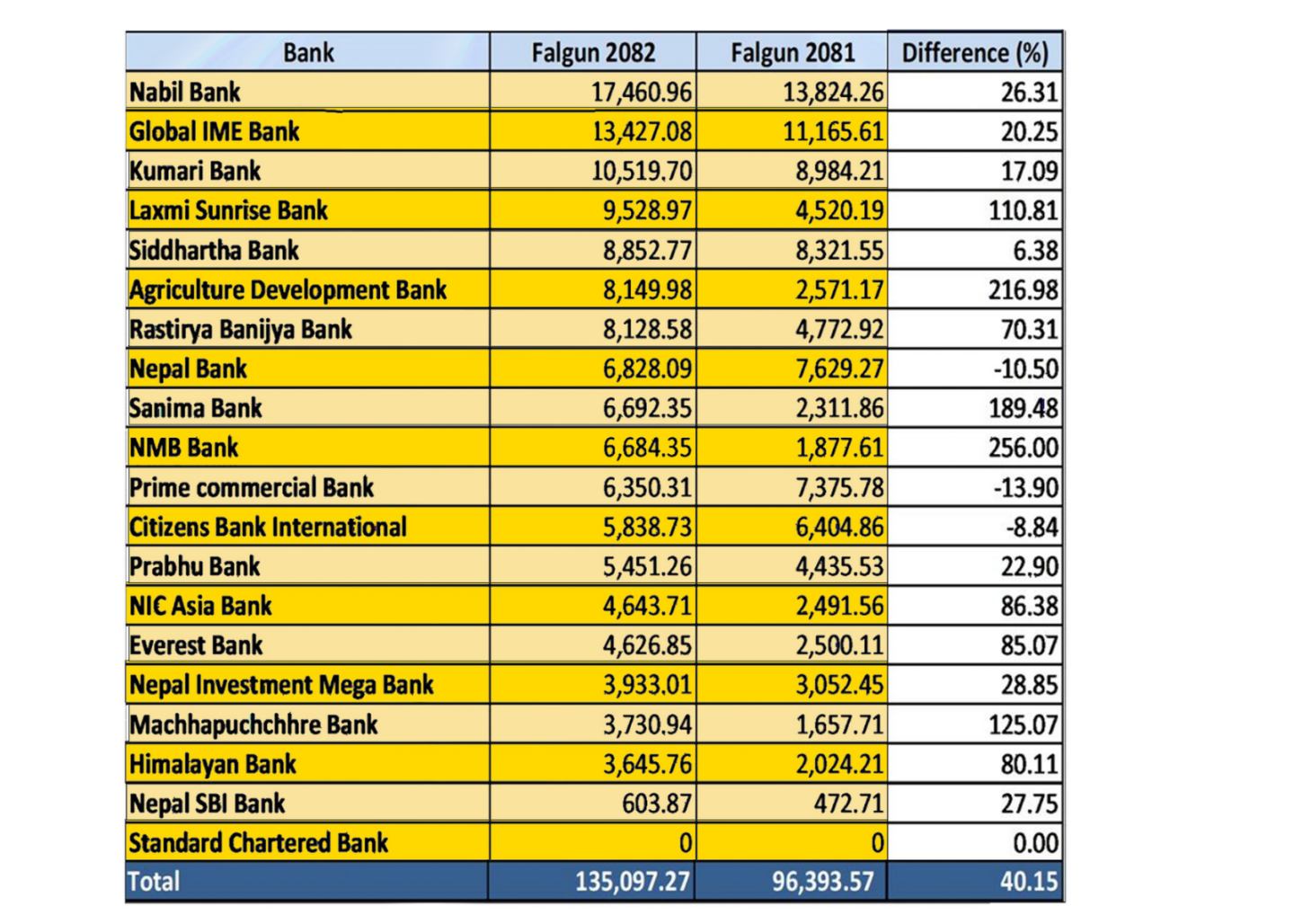 यस अवधिमा नबिल बैंक सेयर कर्जा प्रवाह गर्नेमा सबैभन्दा अगाडि देखिएको छ। नबिलले १७ अर्ब ४६ करोड ९ लाख रुपैयाँ लगानी गरेको छ । जुन अघिल्लो वर्षको तुलनामा २६.३१ प्रतिशतको बढी हो। दोस्रो स्थानमा रहेको ग्लोबल आइएमई बैंकले आफ्नो कर्जा २०.२५ प्रतिशतले बढाएर १३ अर्ब ४२ करोड ७० लाख रुपैयाँ पुर्याएको छ भने कुमारी बैंक १० अर्ब ५१ करोड ९७ लाख रुपैयाँसहित तेस्रो स्थानमा रहेको छ। वृद्धिदरका हिसाबले भने एनएमबि बैंक सबैभन्दा अगाडि देखिएको छ।