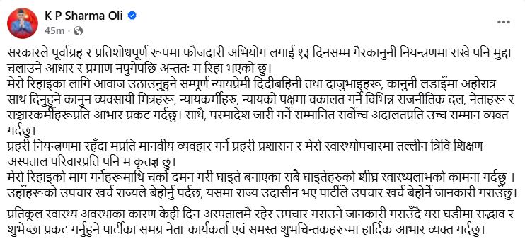 नेकपा एमालेका अध्यक्ष केपी शर्मा ओलीले सरकारले आफूविरुद्ध मुद्दा चलाउने आधार र प्रमाण नभेटेको बताएका छन् । सामाजिक सञ्जाल फेसबुकमार्फत उनले आफूलाई सरकारले पूर्वाग्रह र प्रतिशोधपूर्ण गिरफ्तारी गरिएको पनि बताएका छन् ।