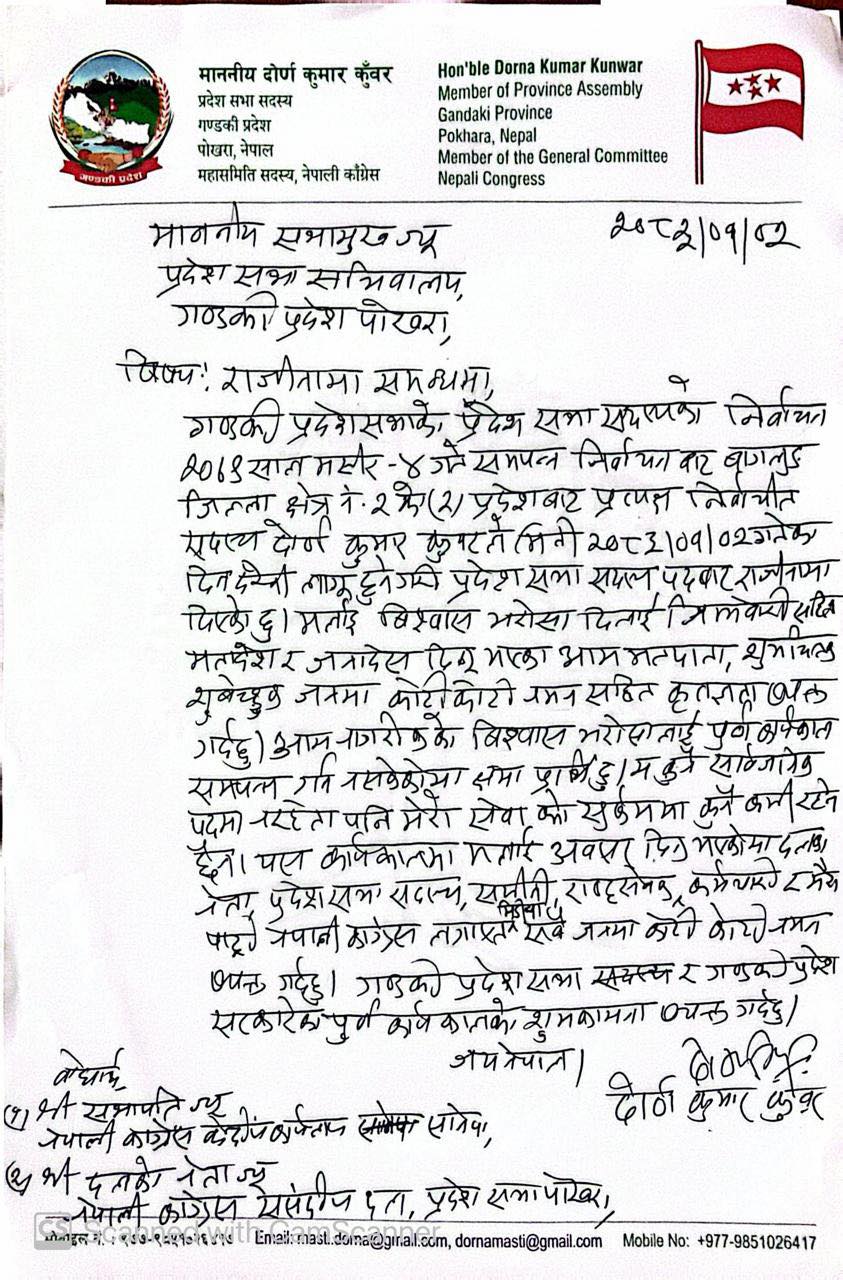 देशसभा सदस्य दोर्णकुमार कुँवरले आफ्नो पदबाट राजीनामा दिएका छन्। उनले बुधबार सभामुखलाई सम्बोधन गर्दै राजीनामा बुझाए पनि औपचारिक रूपमा कारण भने खुलाएका छैनन्। तथापि, उनले जनताको अपेक्षाअनुसार काम गर्न नसकेको भन्दै क्षमायाचना गरेका छन्।